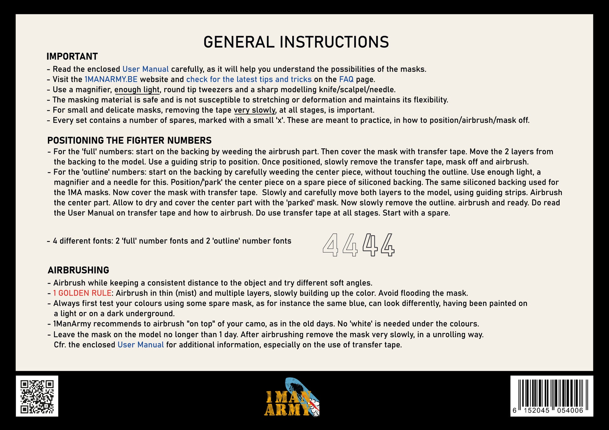 This 1ManArmy set includes weatherable high definition airbrush paint masks to replicate 1/48 WWII Luftwaffe fighter numbers in one size: 13.5 mm. The set consists of four different fonts with 90+ masks suitable for 30+ kits.