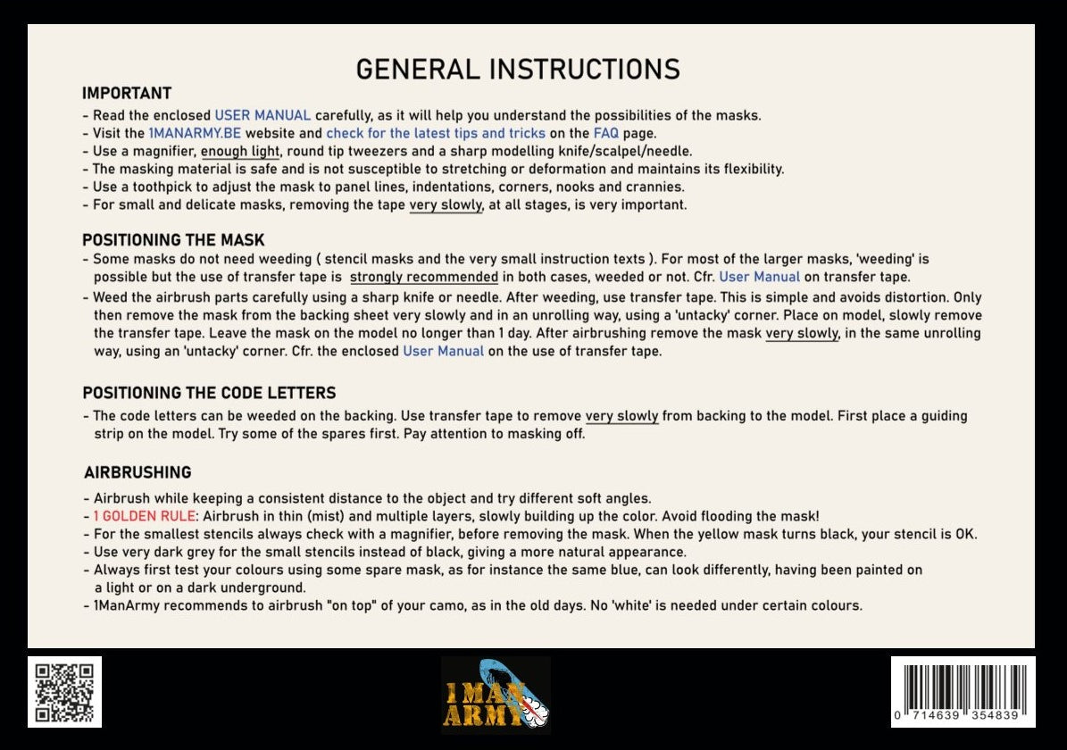 This 1ManArmy set includes weatherable high definition airbrush paint masks to replicate 1/48 WWII British RAF 24-inch code letters. The set consists of 149 masks suitable for 20+ kits.