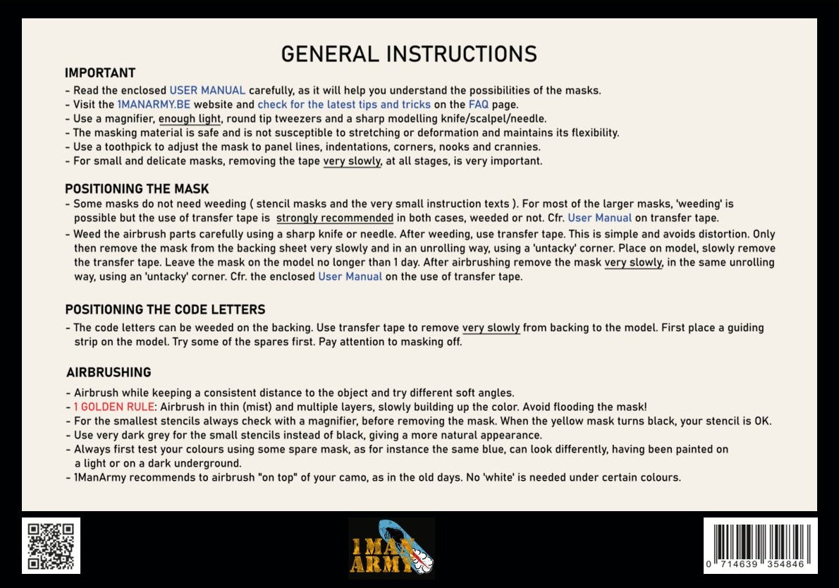 This 1ManArmy set includes weatherable high definition airbrush paint masks to replicate 1/48 WWII British RAF 30-inch code letters. The set consists of 100 masks suitable for 15+ kits.