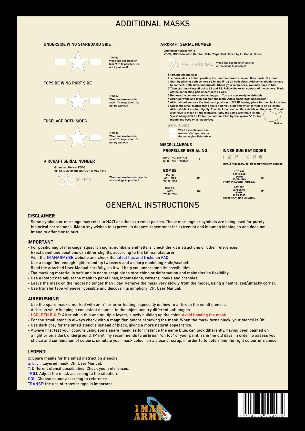 This 1ManArmy set includes high definition airbrush paint masks for the basic markings and stencils of the 1/24 Grumman F6F-5 Hellcat by Airfix.