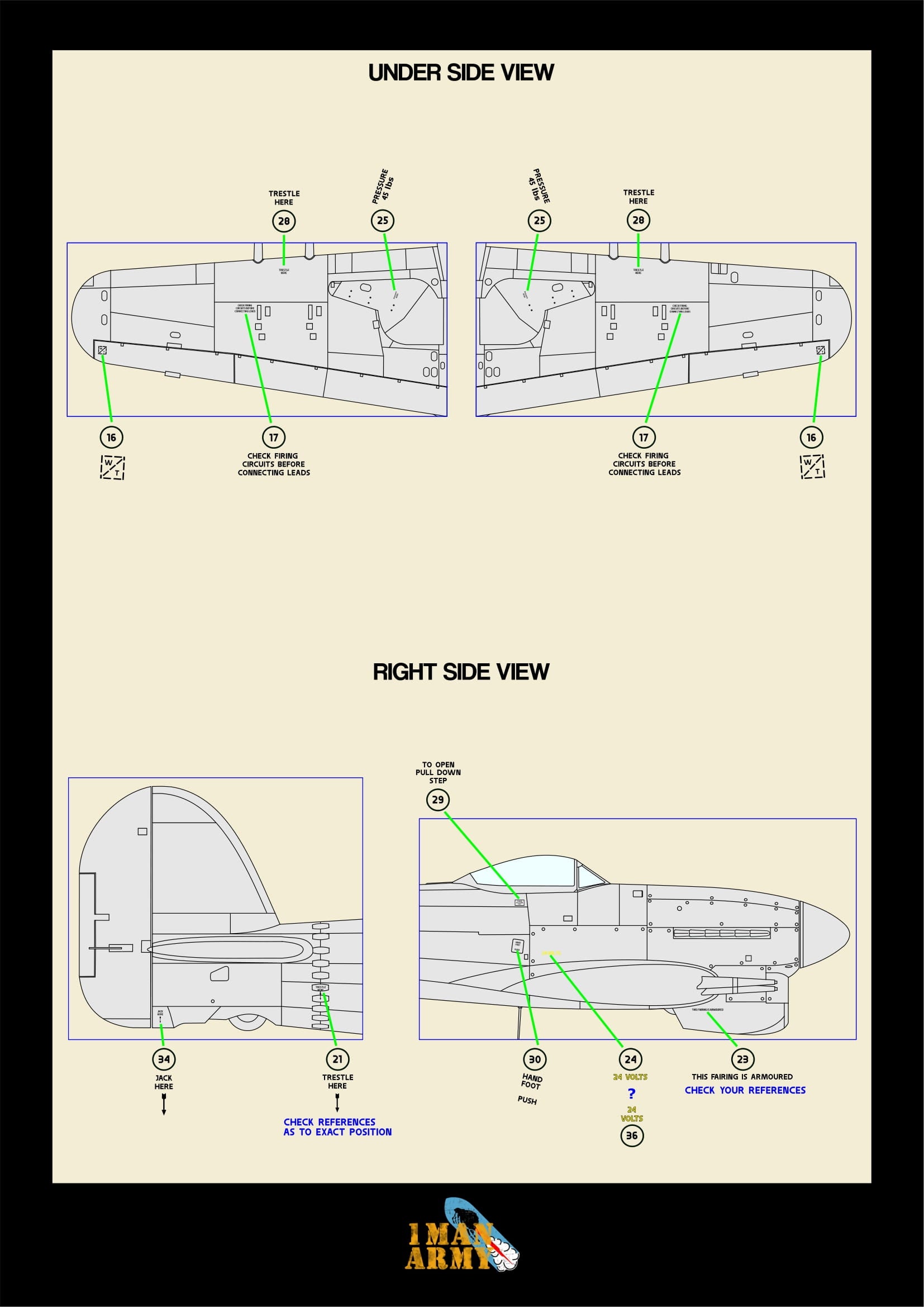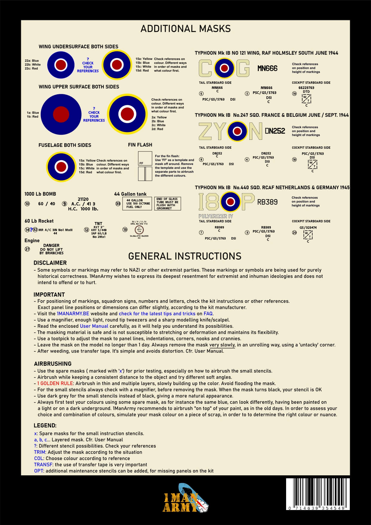 This 1ManArmy set includes high definition airbrush paint masks for the basic markings and stencils of the 1/24 Hawker Typhoon Mk.IB by Airfix.