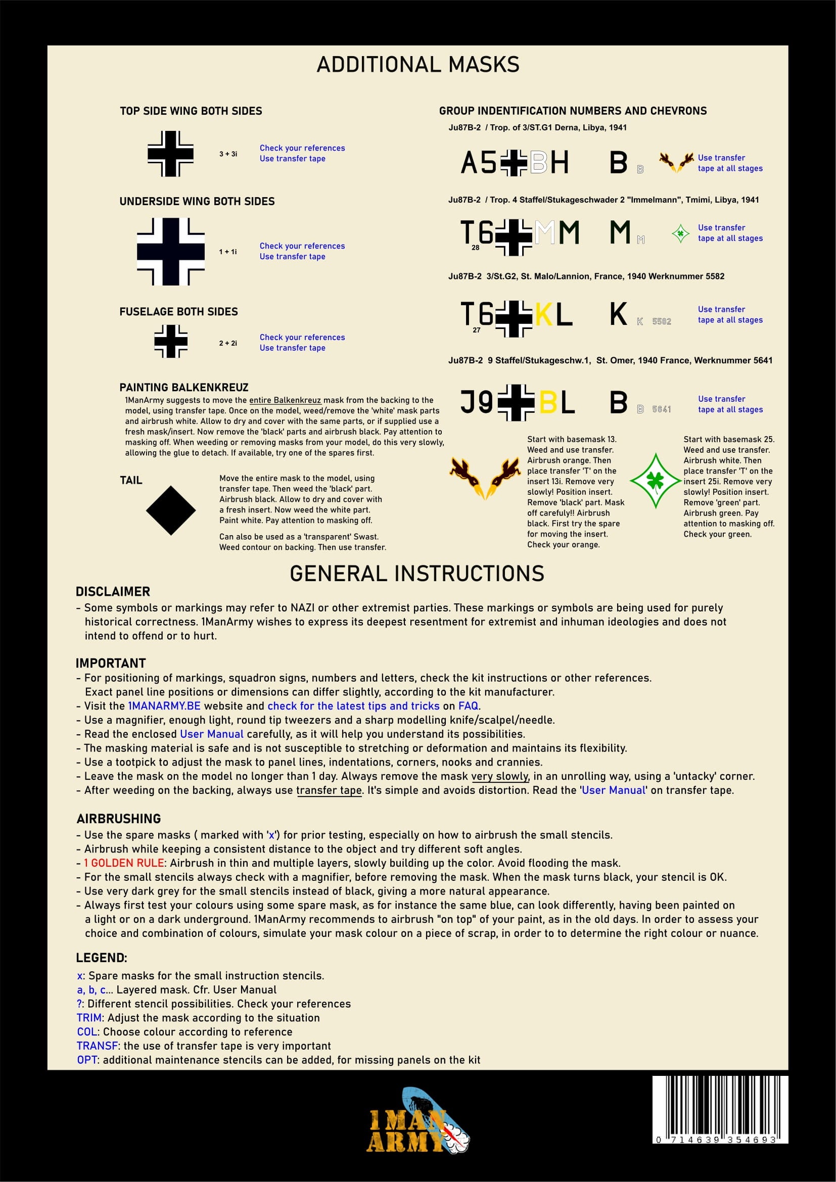 This 1ManArmy set includes high definition airbrush paint masks for the basic markings and stencils of the 1/24 Junkers Ju 87B by Airfix.