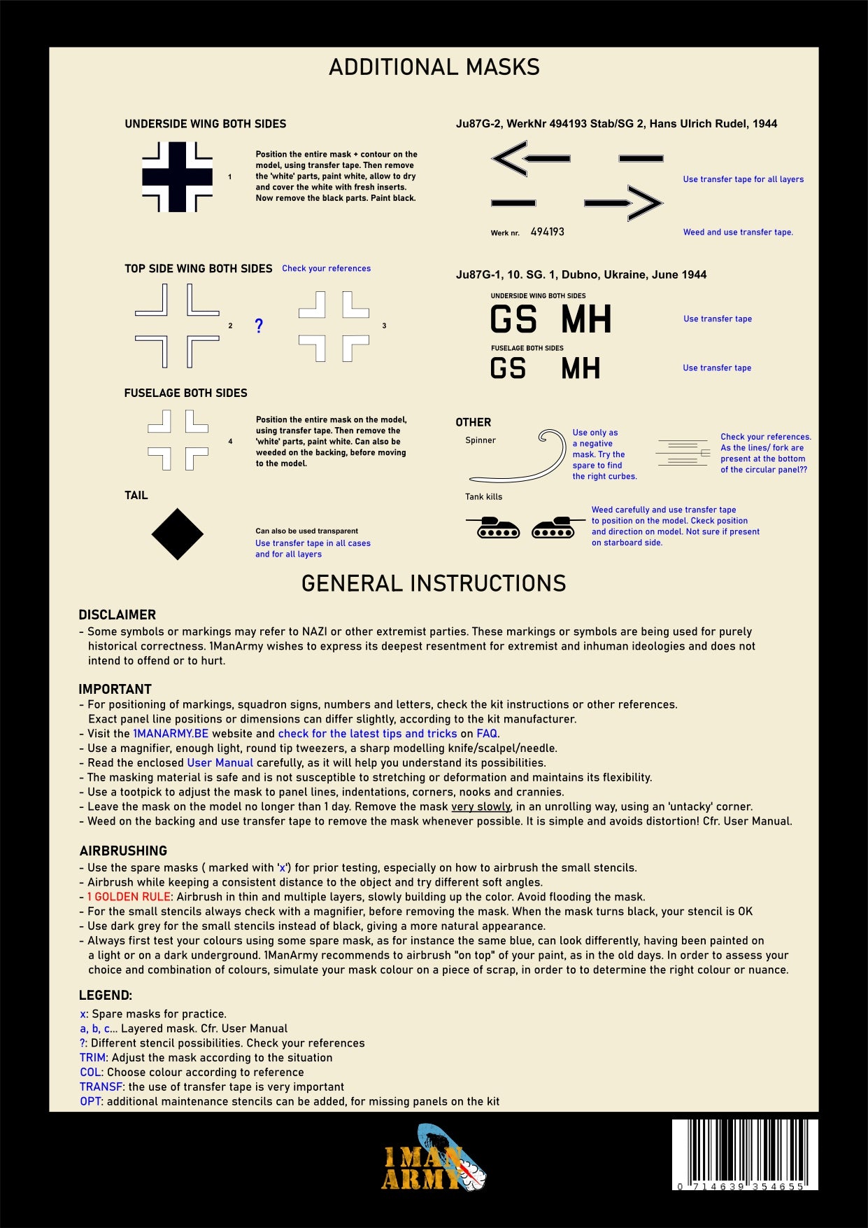 This 1ManArmy set includes high definition airbrush paint masks for the basic markings and stencils of the 1/35 Junkers Ju87G "Stuka" by Border.
