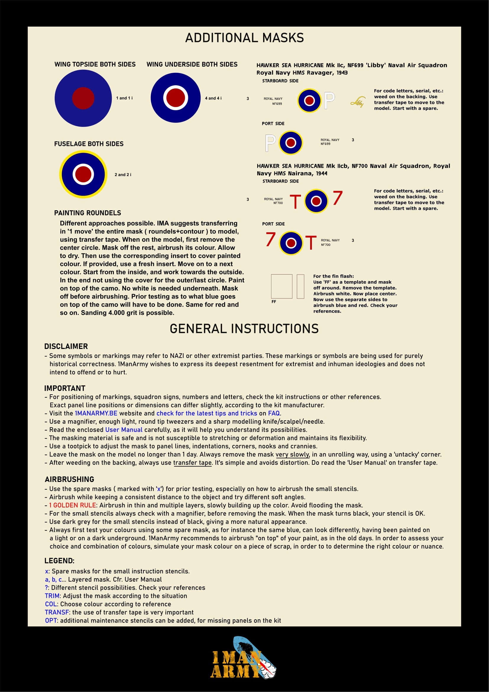This 1ManArmy set includes high definition airbrush paint masks for the basic markings and stencils of the 1/32 Hawker Sea Hurricane Mk.IIc by Revell.