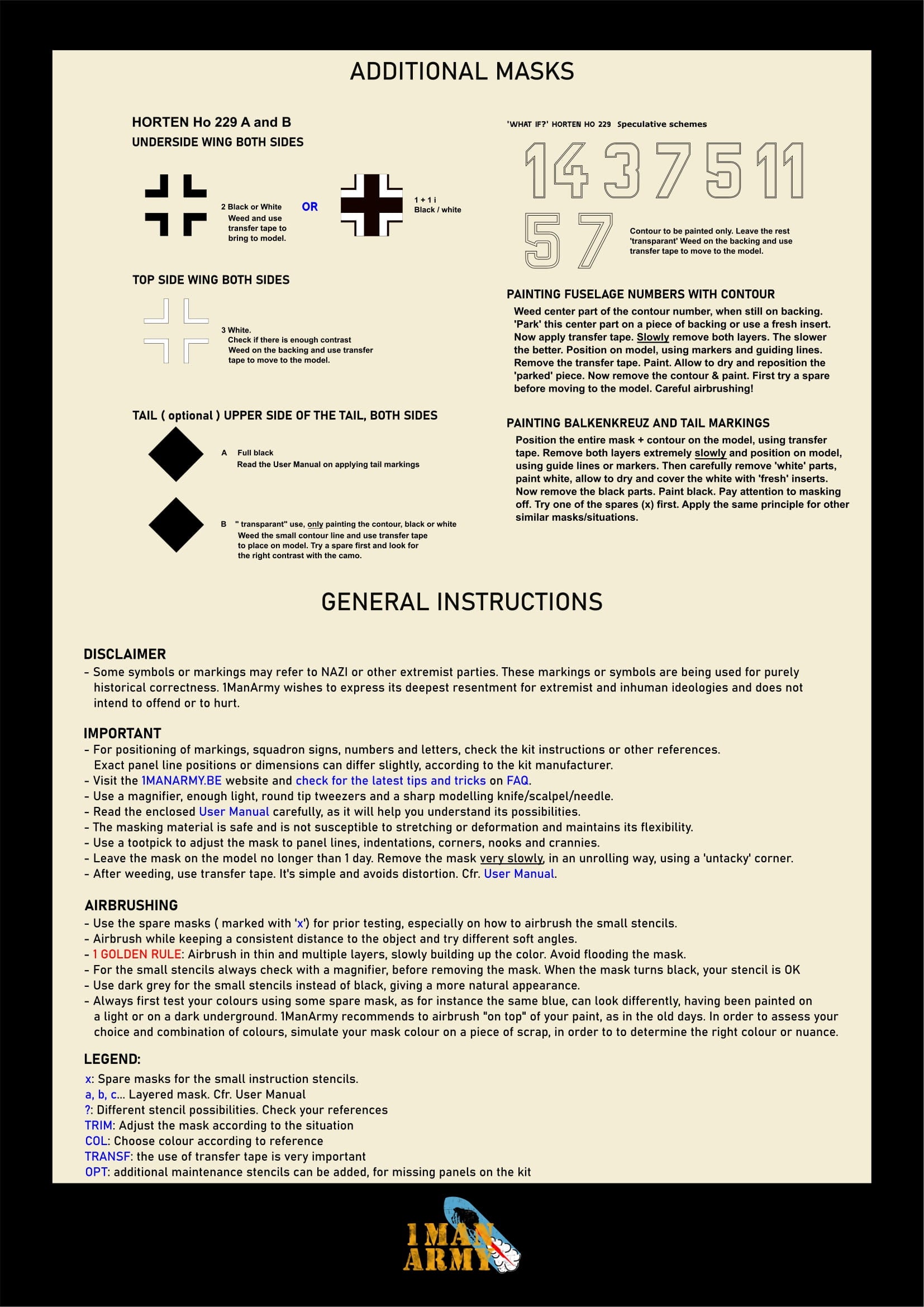 1ManArmy Takom Horten Ho229 A/B 1/32 Basic Markings & Stencil High-Definition Paint Masks, 32DET050