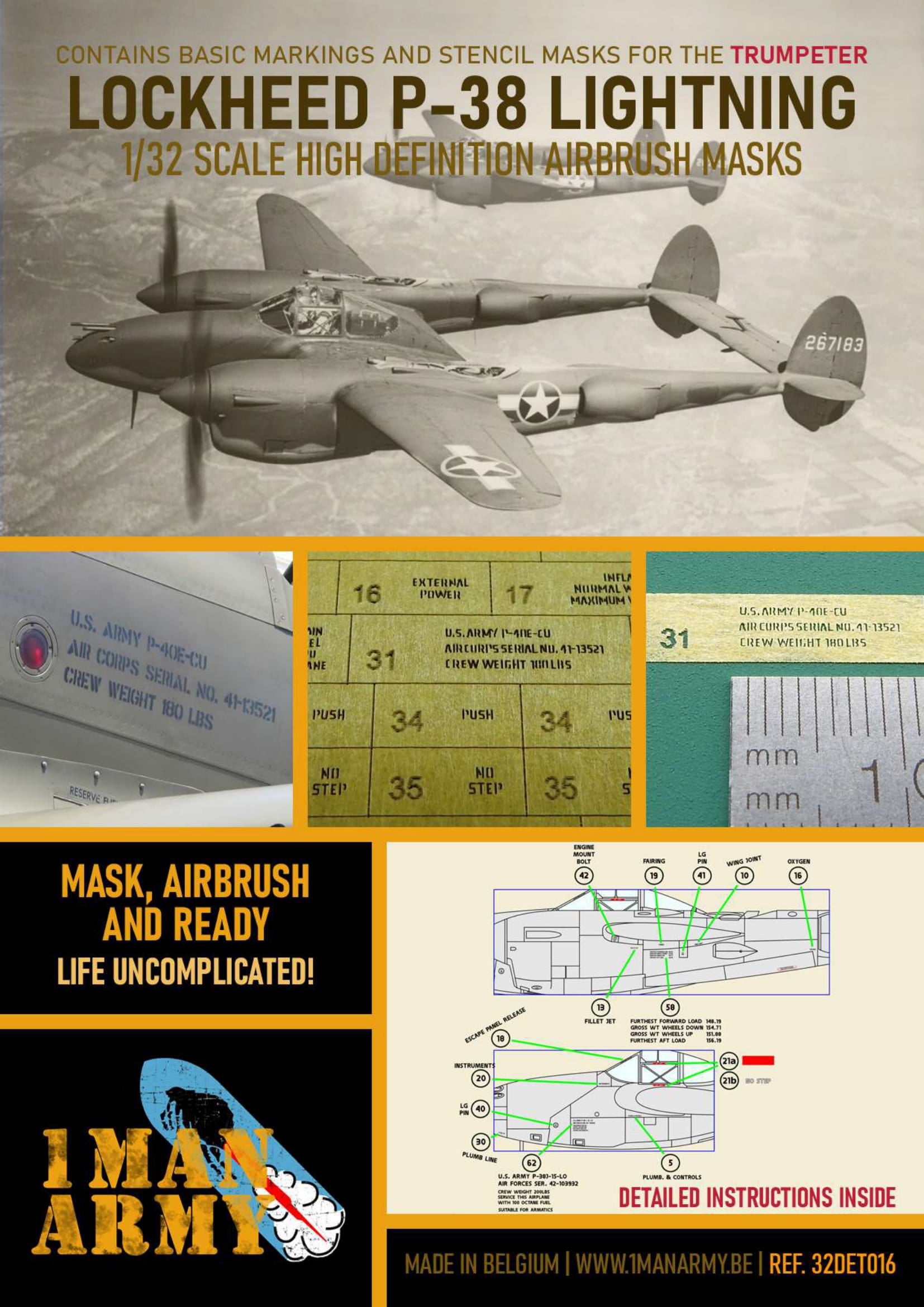 This 1ManArmy set includes high definition airbrush paint masks for the basic markings and stencils of the 1/32 Lockheed P-38 Lightning by Trumpeter.