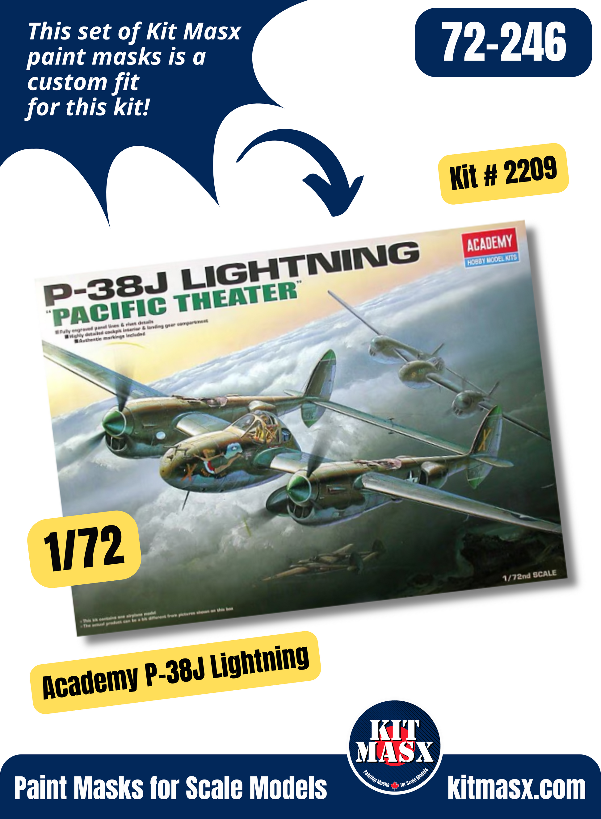 This set includes paint masks for both outer canopy options and wheels of the 1/72 Lockheed P-38J Lightning by Academy.
