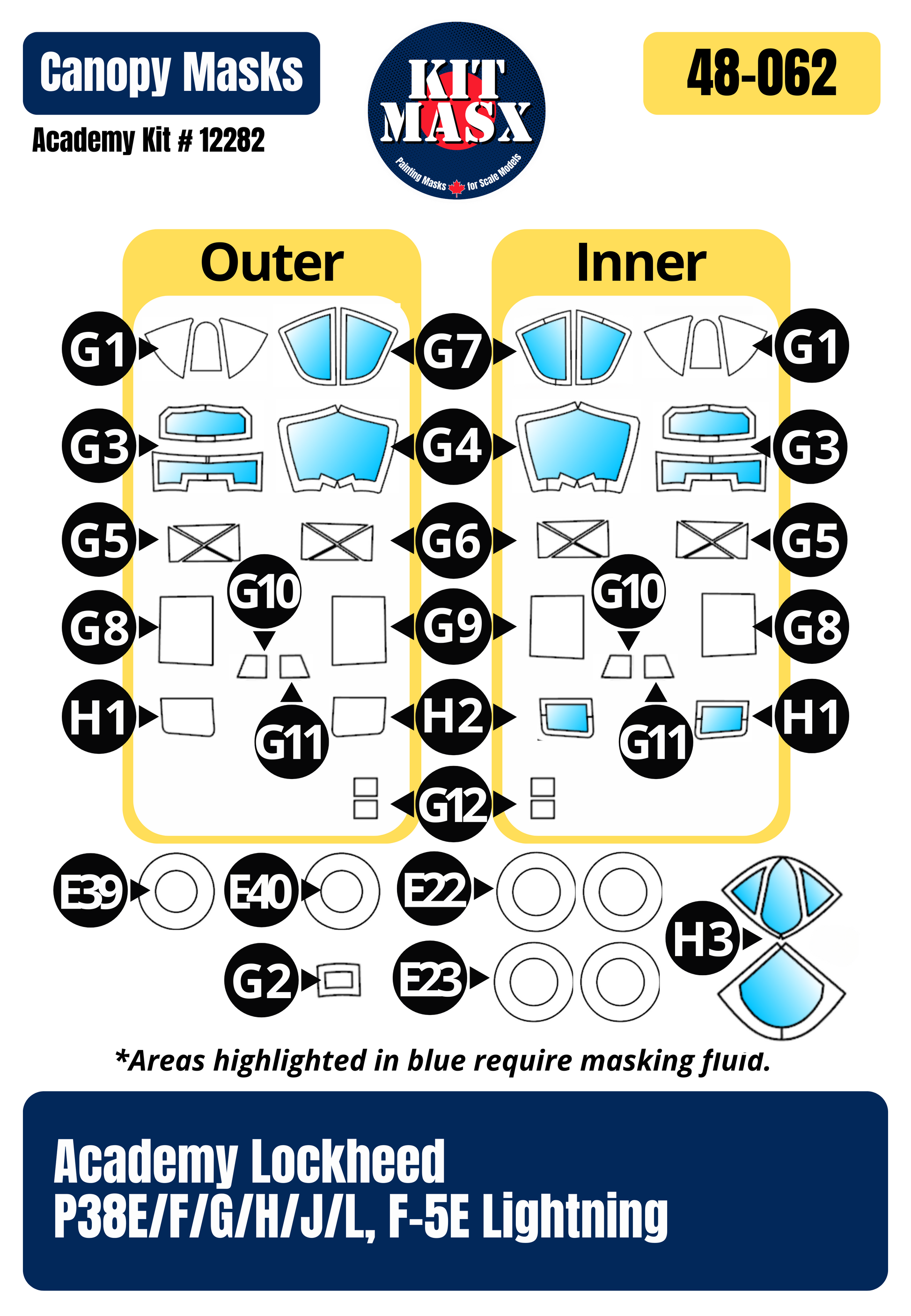 Academy Lockheed P38E/F/G/H/J/L, F-5E Lightning 1/48 Canopy & Wheel Paint Masks, Kit # 12282