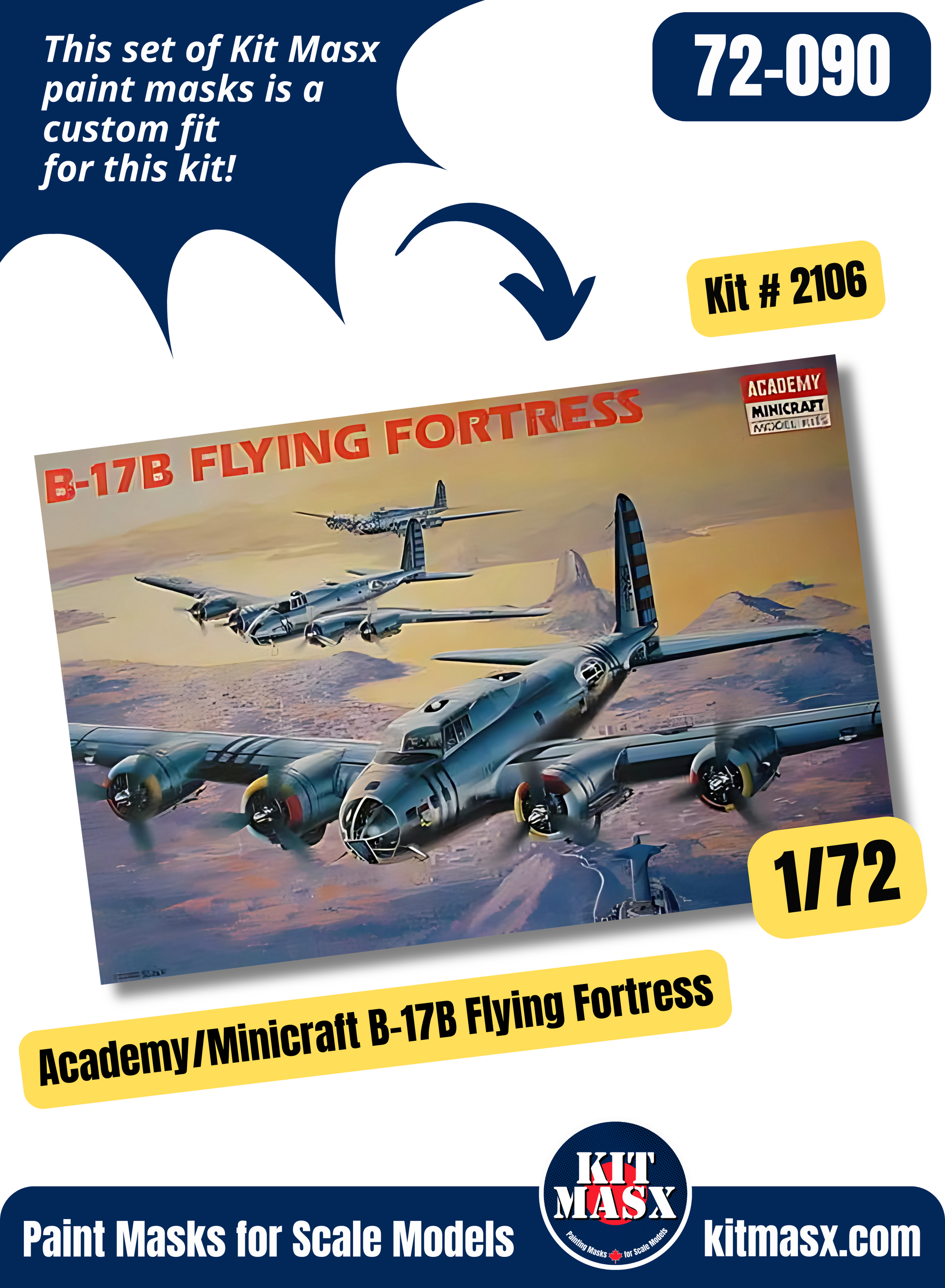 ❗ Note: Although the B-17 B-G series is produced by Academy, this set only fits the B-D models. We have a set for the B-17E Academy kit here: Academy Boeing B-17E Flying Fortress 1/72 Canopy & Wheel Paint Masks, Kit # 12533.