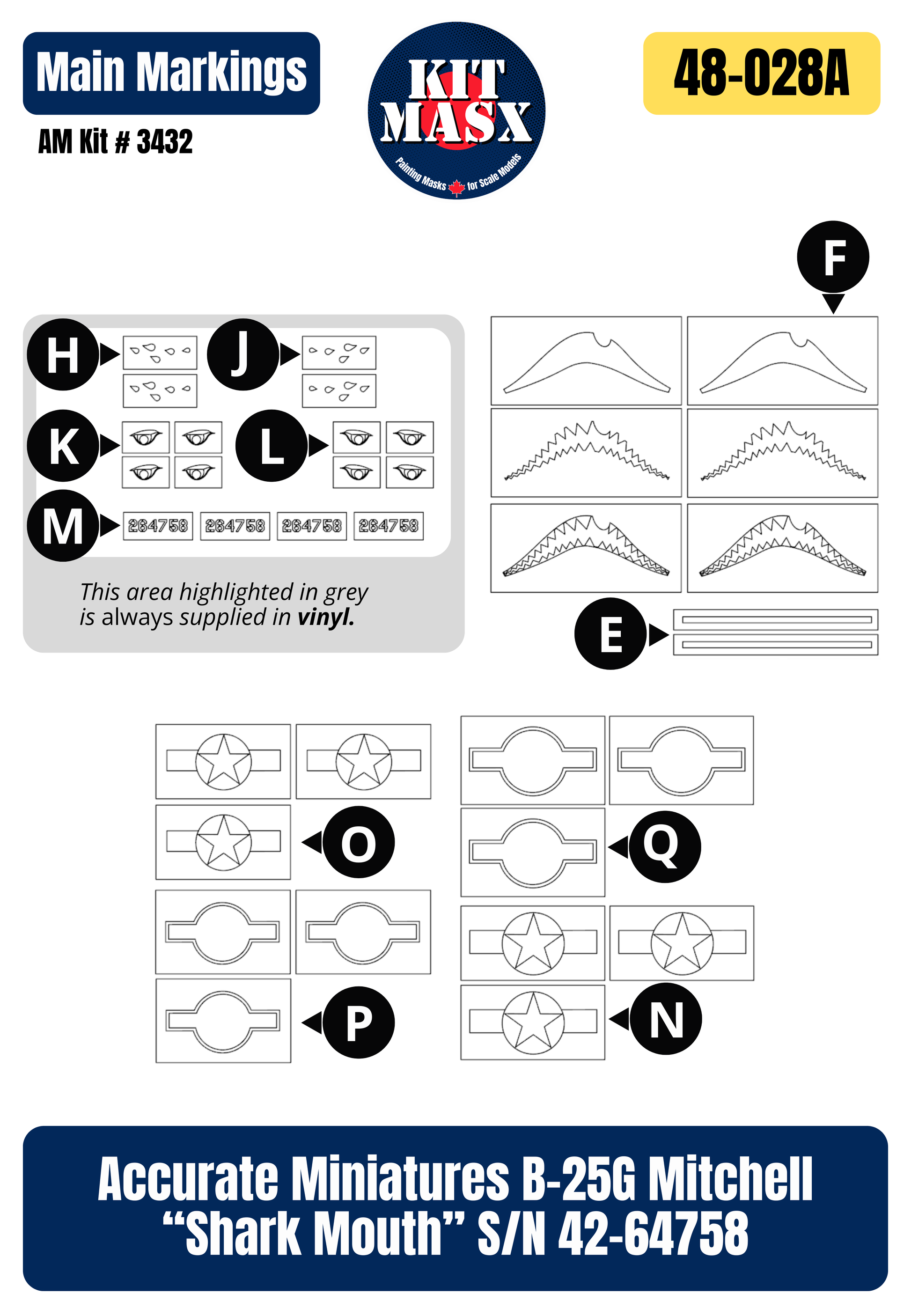 2. Main Markings: Accurate Miniatures B-25G Mitchell “Shark Mouth” S/N 42-64758 1/48 Main Marking Paint Masks, Kit # 3432