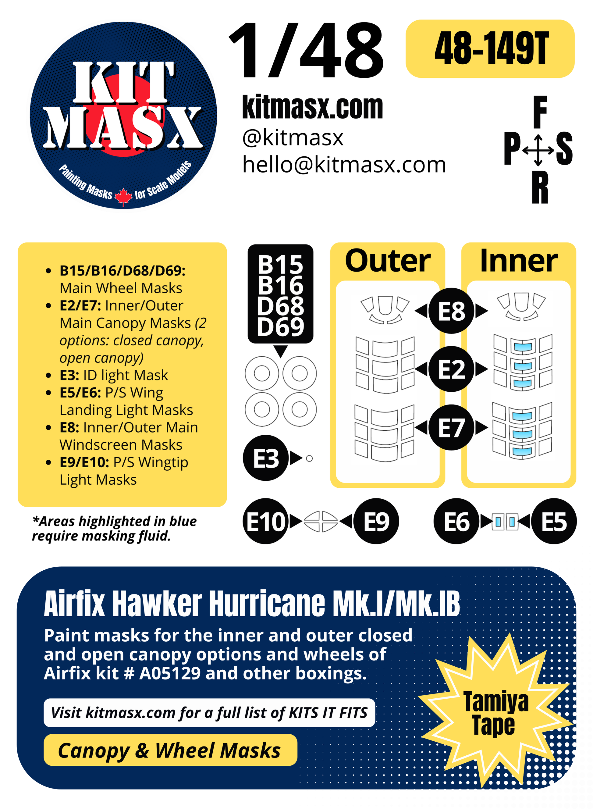 This set includes paint masks for the inner and outer closed and open canopy options and wheels of the 1/48 Hawker Hurricane Mk.I or Mk.IB by Airfix.