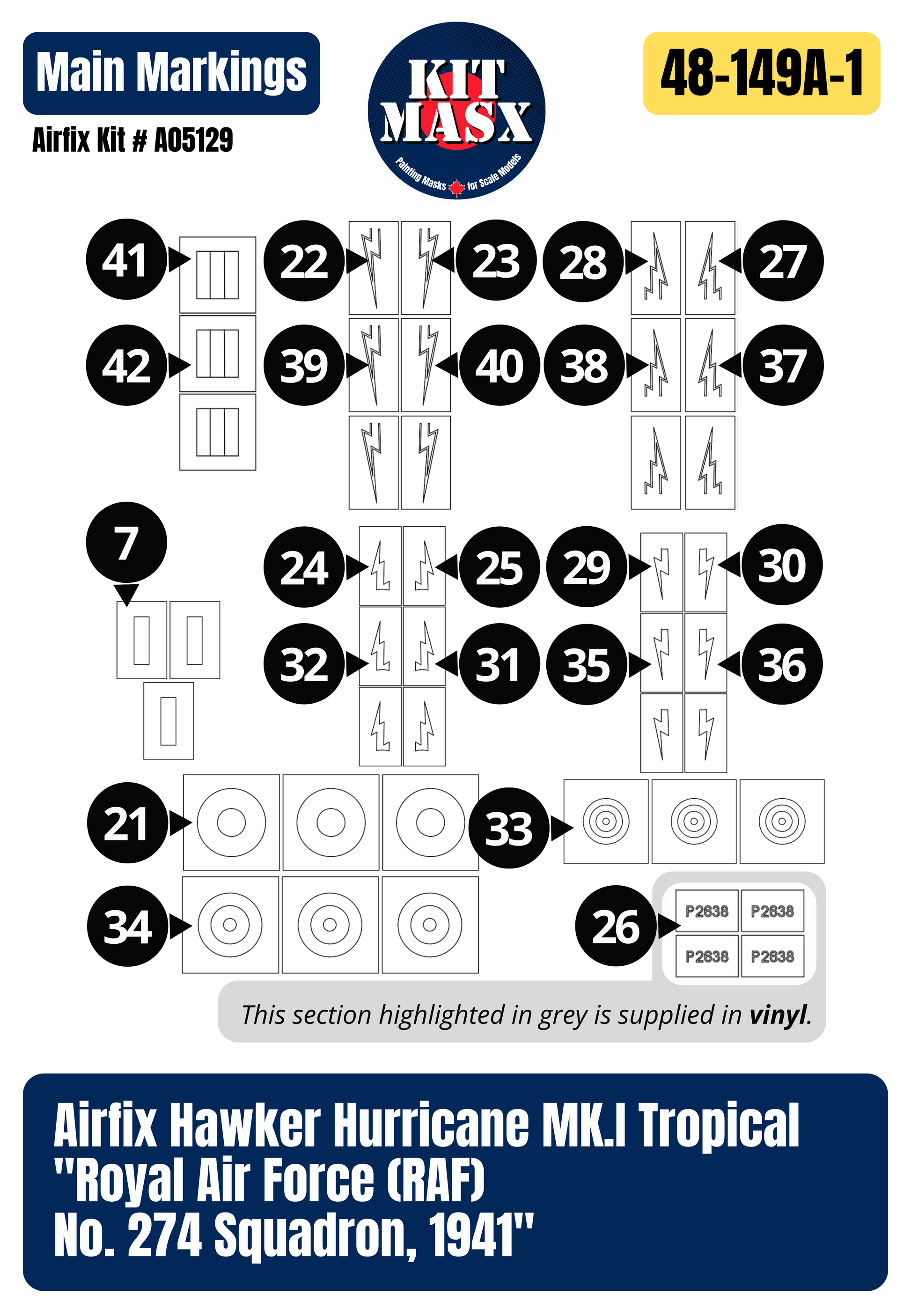 - 👉 Main Markings for Royal Air Force (RAF) No. 274 Squadron, 1941 (Decal sheet part #'s 7, 21-42 )
