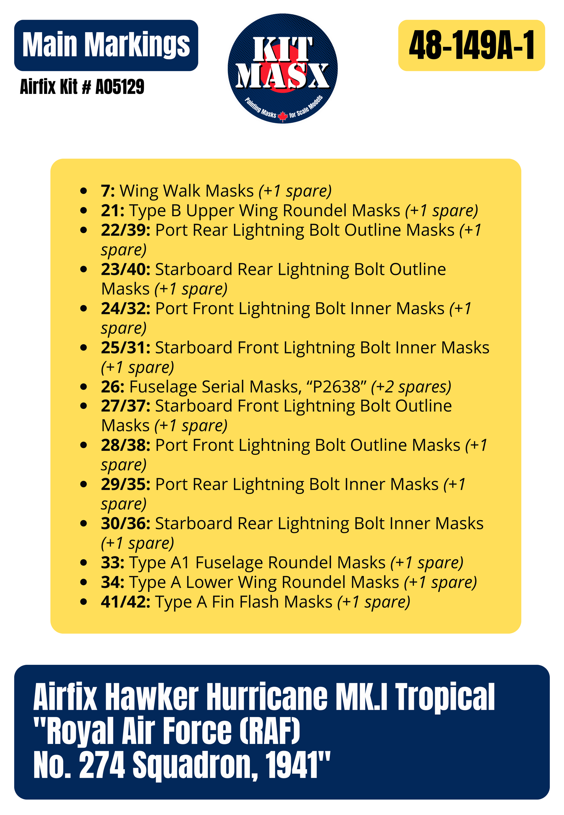 Airfix Hawker Hurricane Mk.I Tropical "Royal Air Force (RAF) No. 274 Squadron, 1941" 1/48 Master Mask Set, Kit # A05129