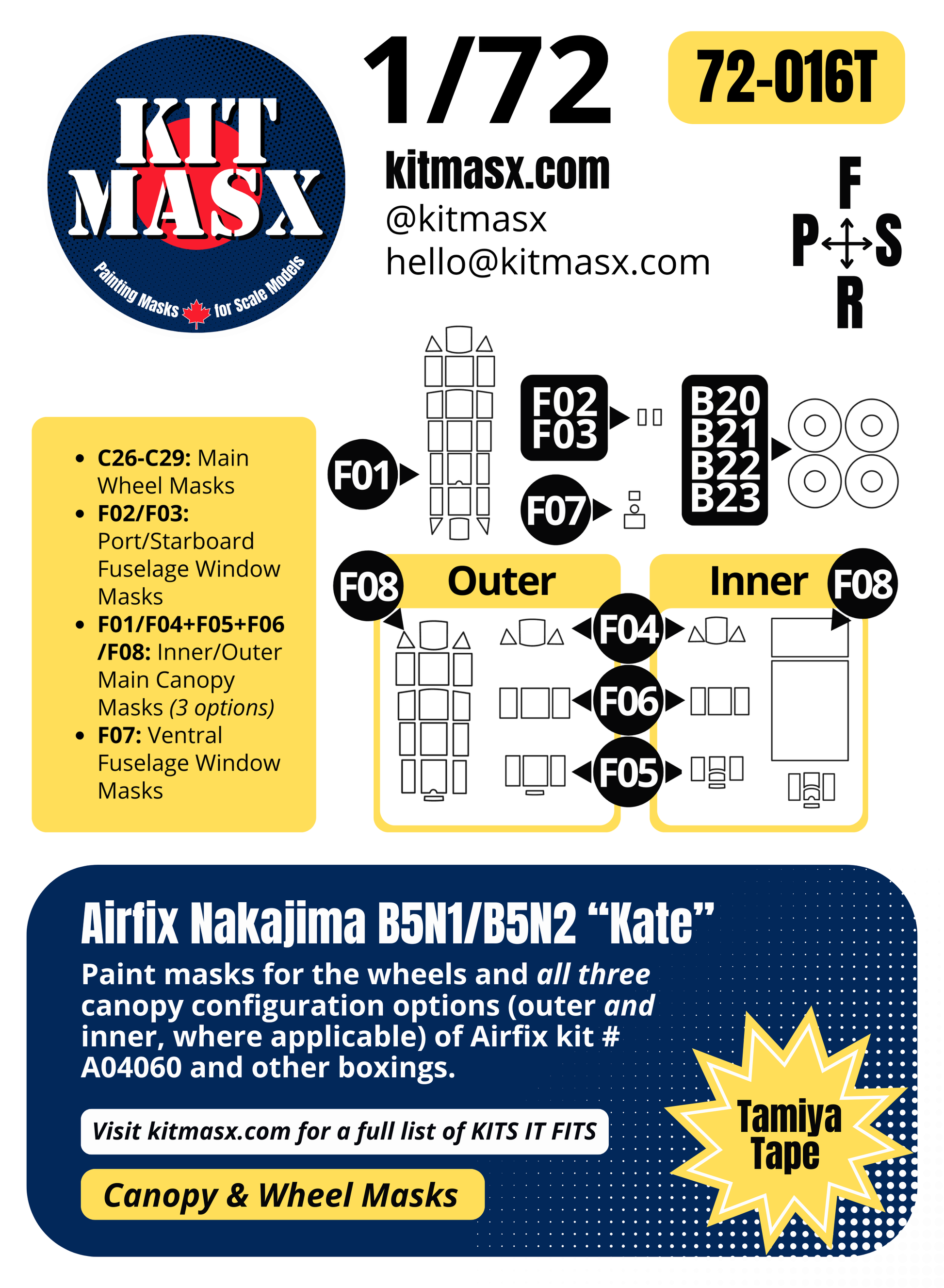 This set includes paint masks for the wheels and all three canopy configuration options (outer and inner, where applicable) of the Nakajima B5N1 or B5N2 “Kate” by Airfix.