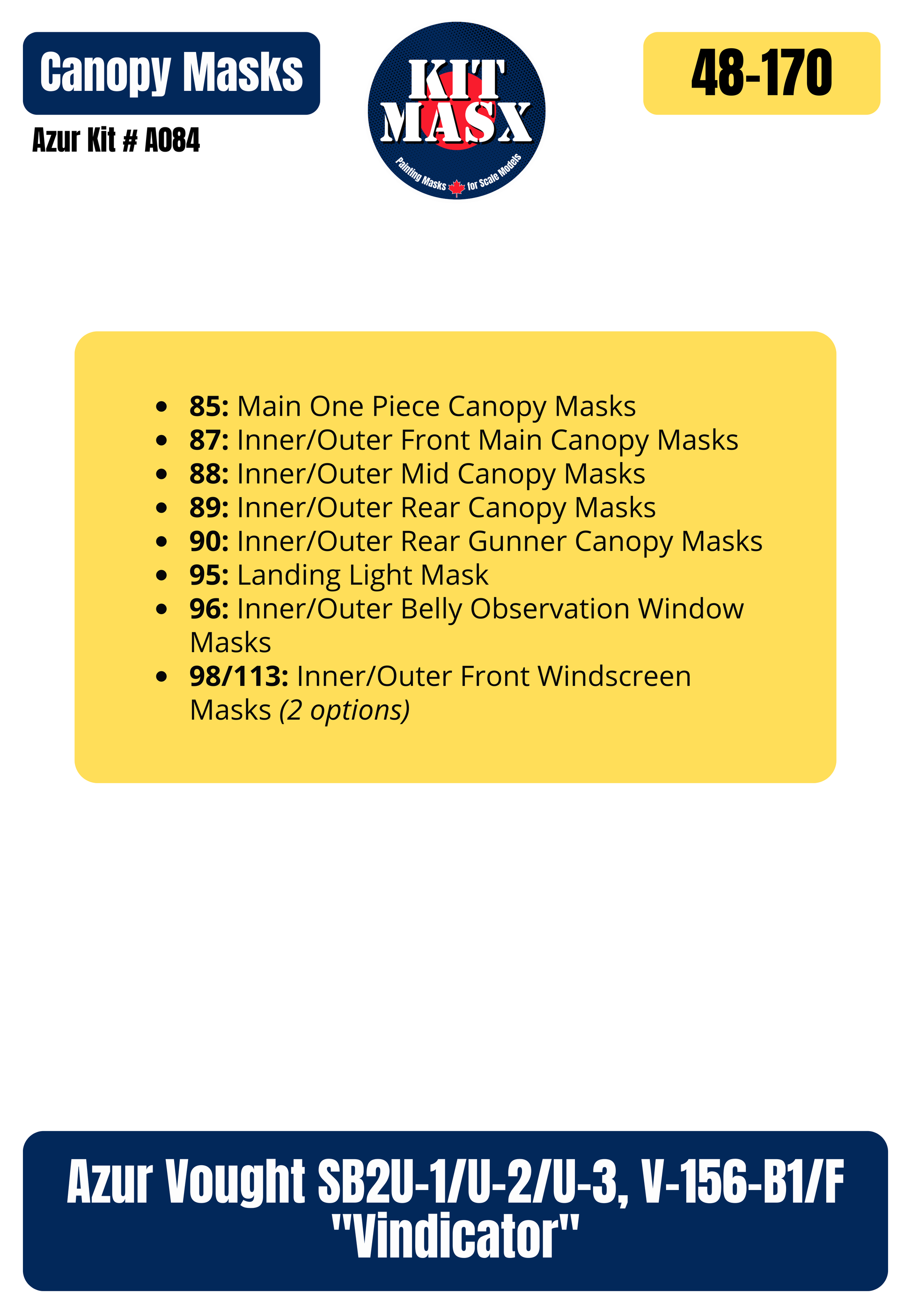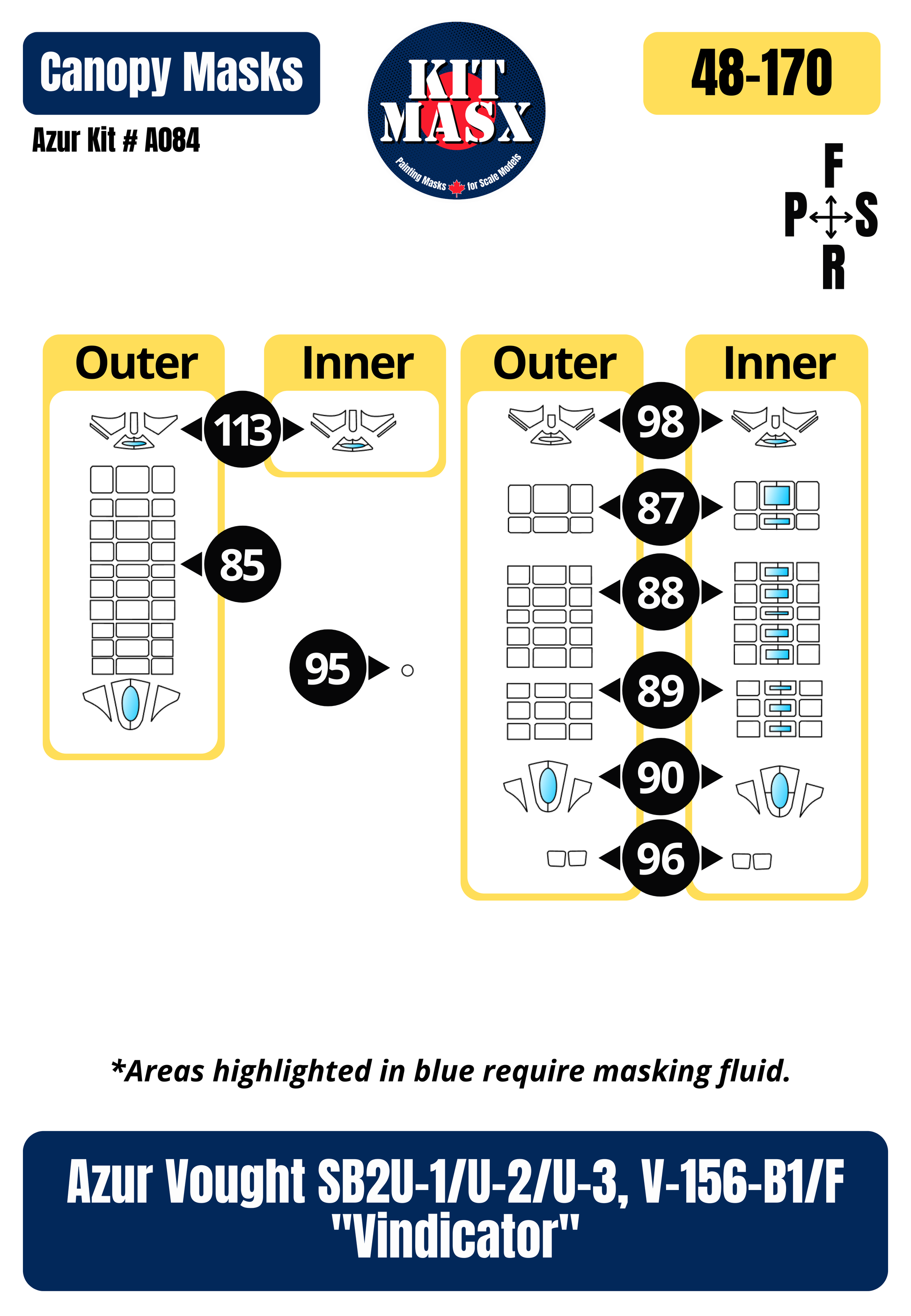 Azur Vought SB2U-1/U-2/U-3, V-156-B1/F "Vindicator" 1/48 Canopy Paint Masks, Kit # A084
