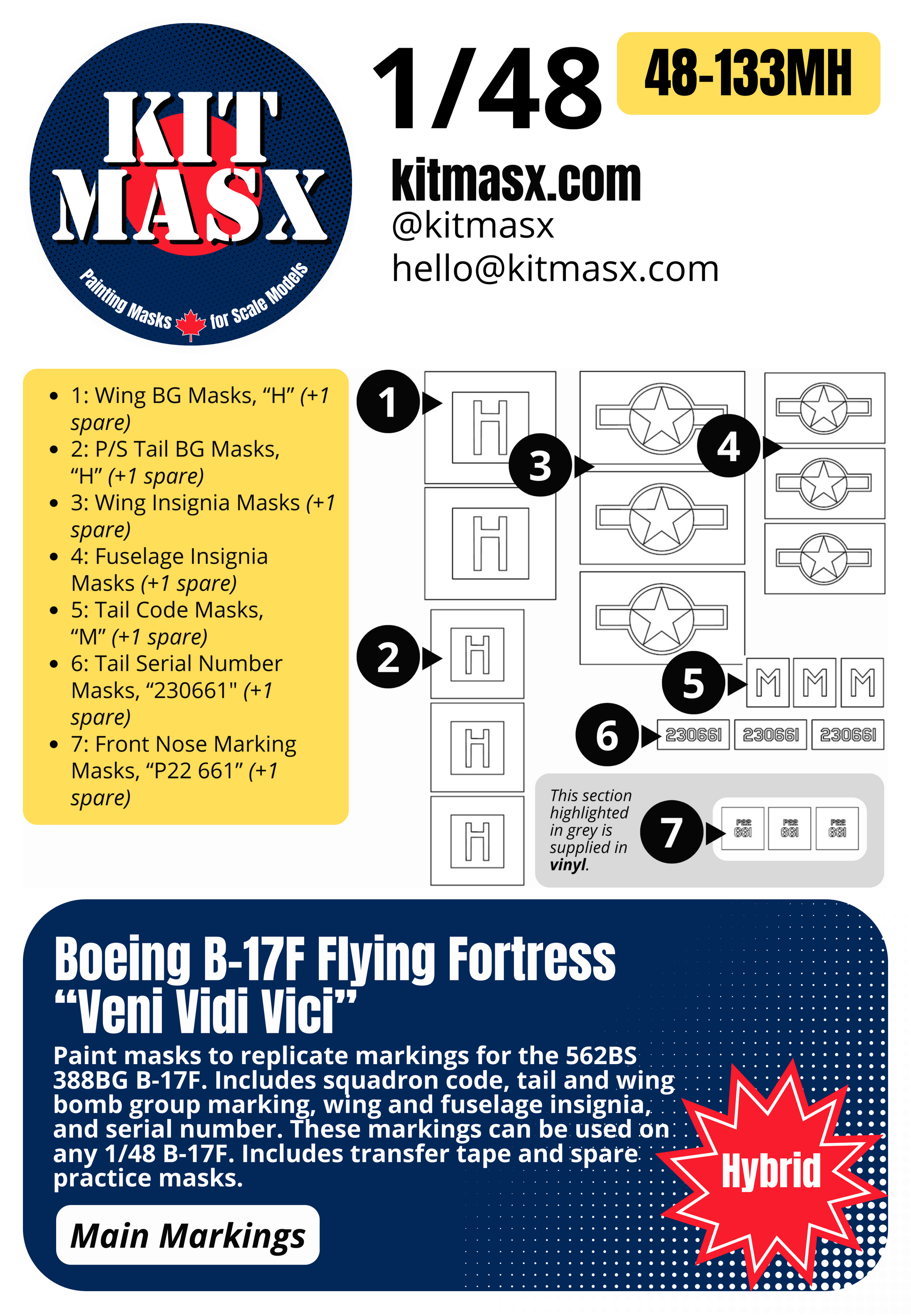This set includes paint masks to replicate markings for the B-17F (562BS, 388BG) including tail and wing bomb group markings, tail code, serial number, wing and fuselage insignia, and nose marking. The “Veni Vidi Vici” nose art and small airframe markings are not included in this set and will be required from the decal sheet.