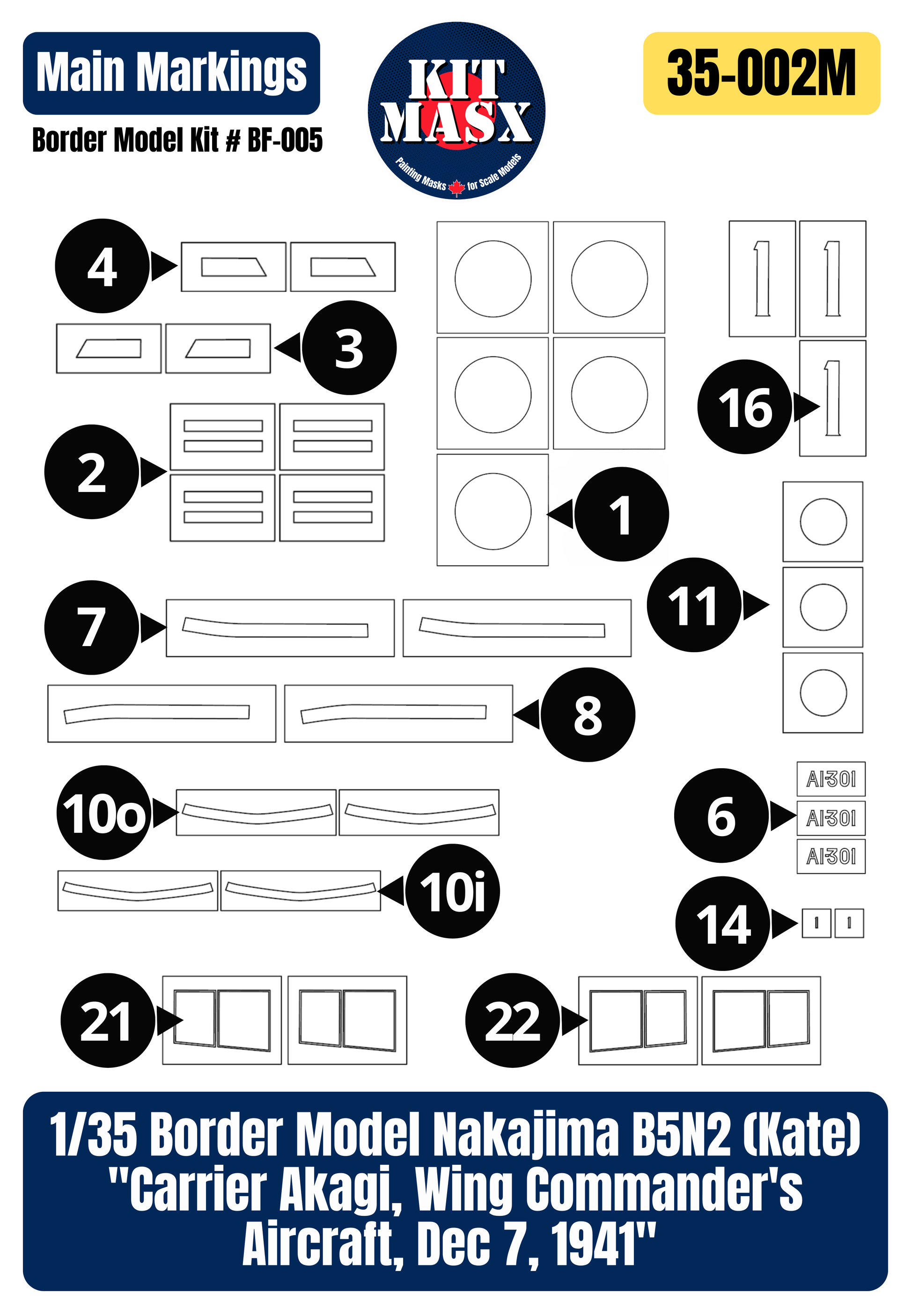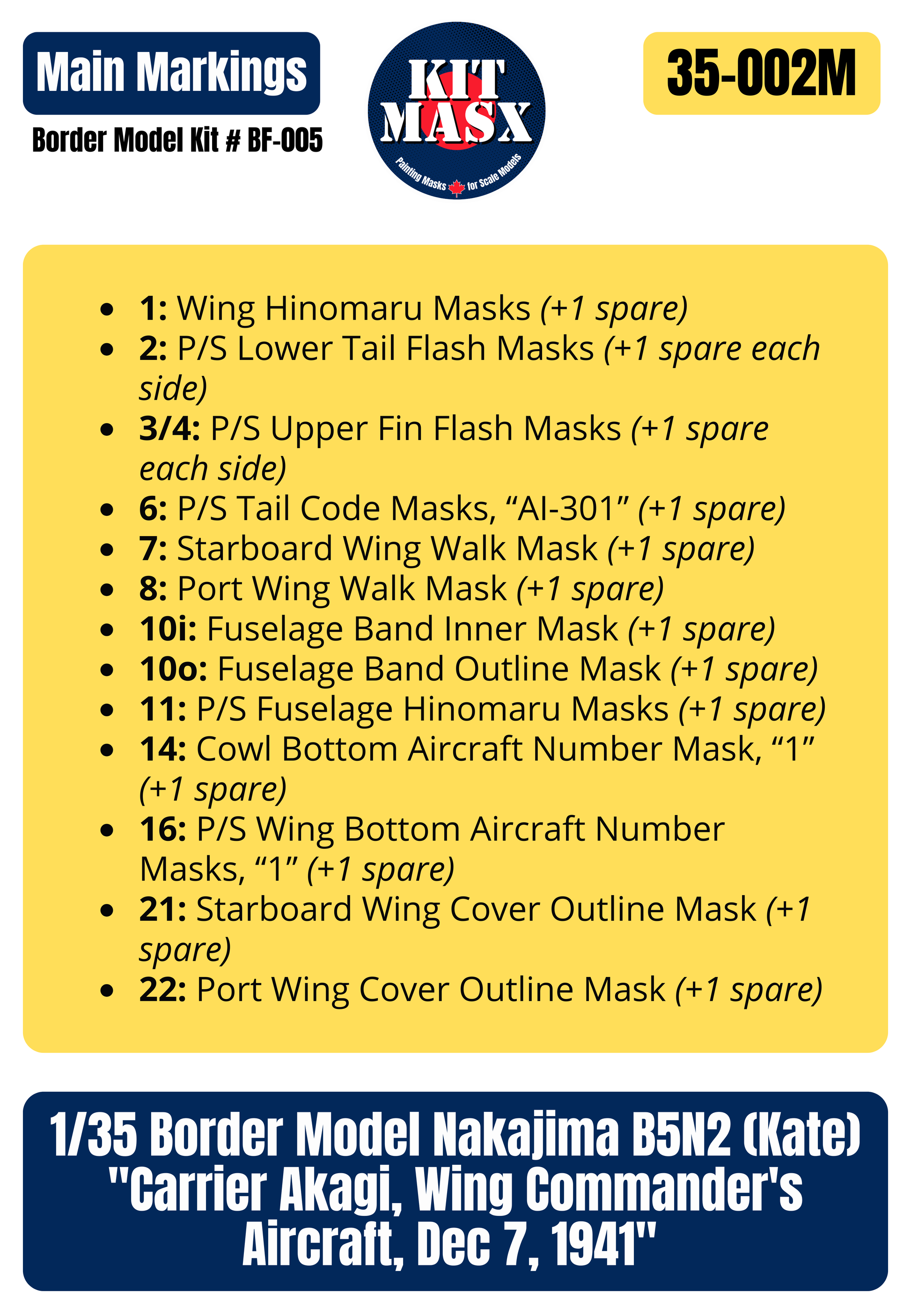 This set provides paint masks to replicate the main markings for the “Carrier Akagi, Wing Commander’s Aircraft, Dec 7, 1941” option from Border Model kit # BF-005. Originally designed for 1/48, we scaled this set up for use on 1/35 builds.