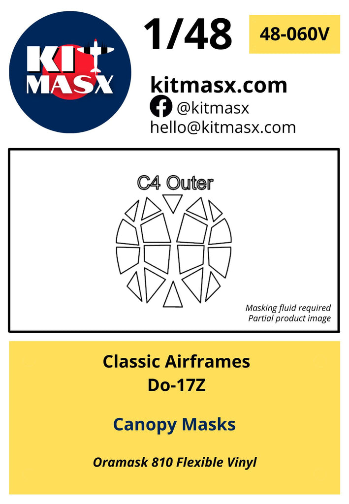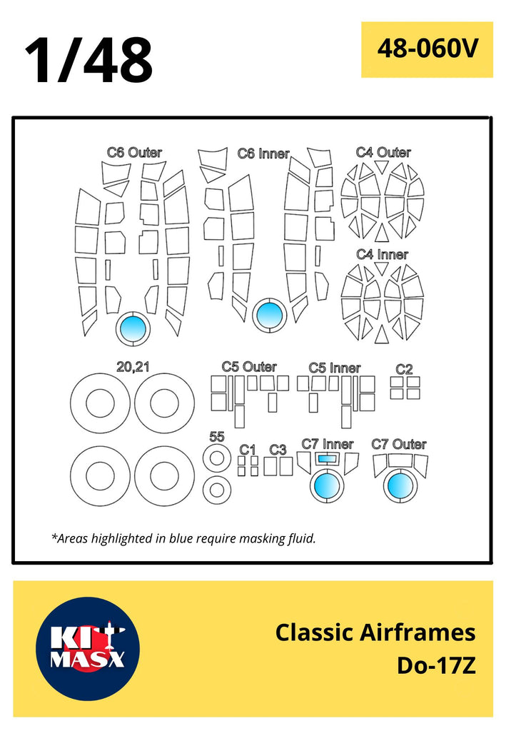 This set includes paint masks for the inner and outer canopies and wheels of the 1/48 "Flying Pencil", the Dornier Do 17Z, by Classic Airframes.