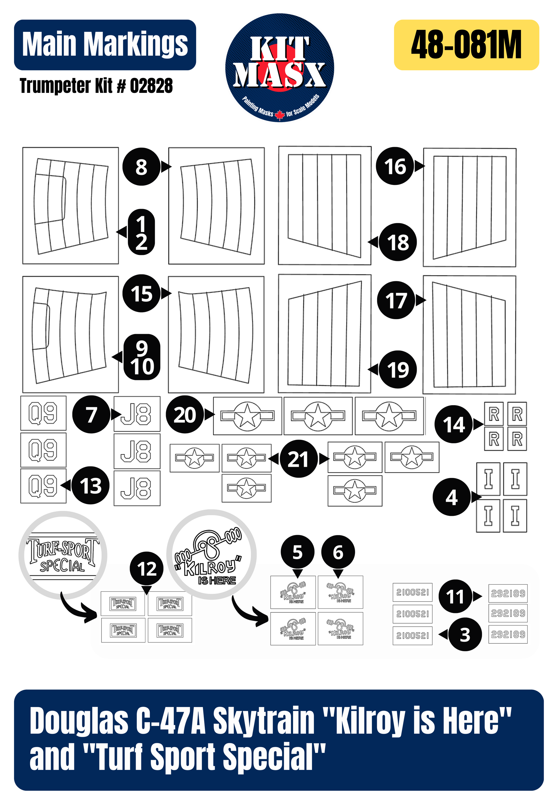 Douglas C-47A Skytrain "Kilroy is Here" and "Turf Sport Special" 1/48 Main Marking Paint Masks, Kit # 02828