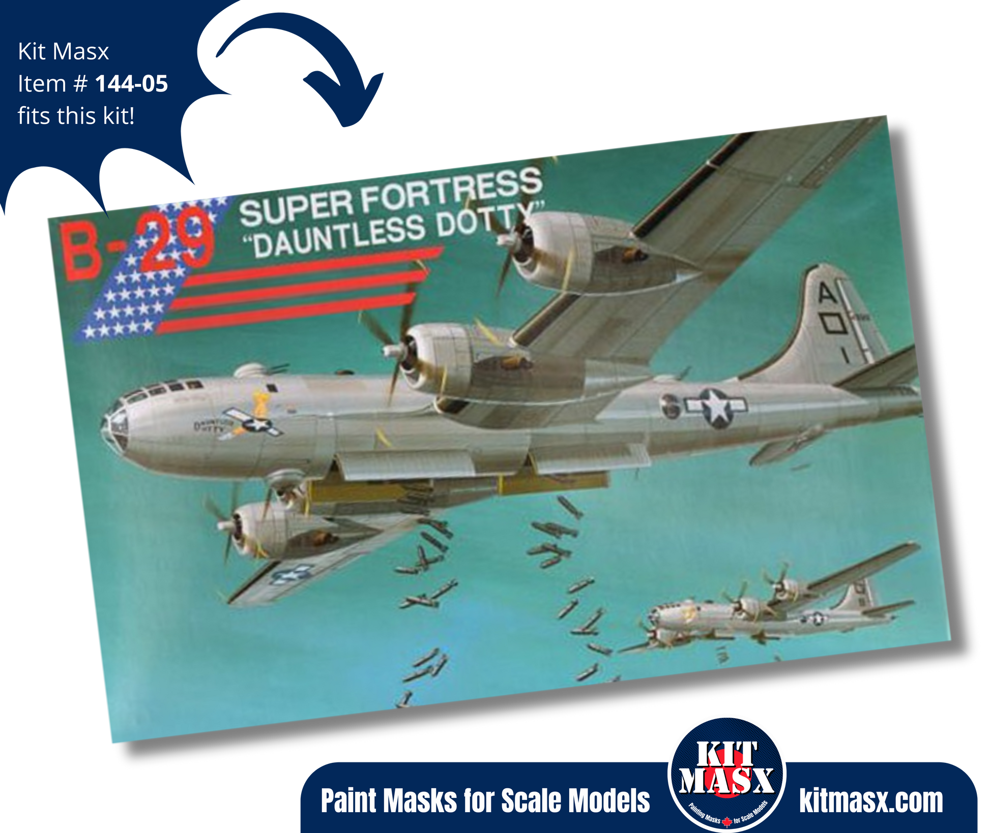 This set includes paint masks for the outer canopies and wheels of the Boeing B-29 Superfortress, F-13A, or KB-29P Tanker in 1/144 scale.