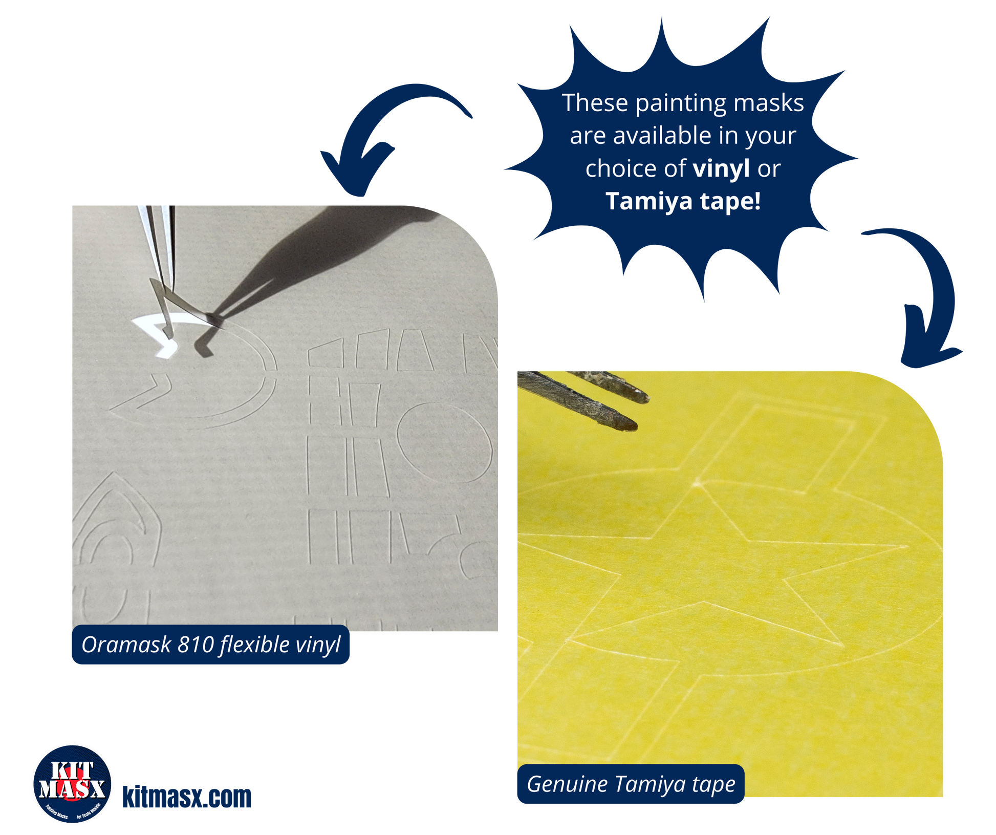 MATERIAL: This painting mask set is available in your choice of easy-to-apply Oramask 810 flexible vinyl or genuine Tamiya tape.