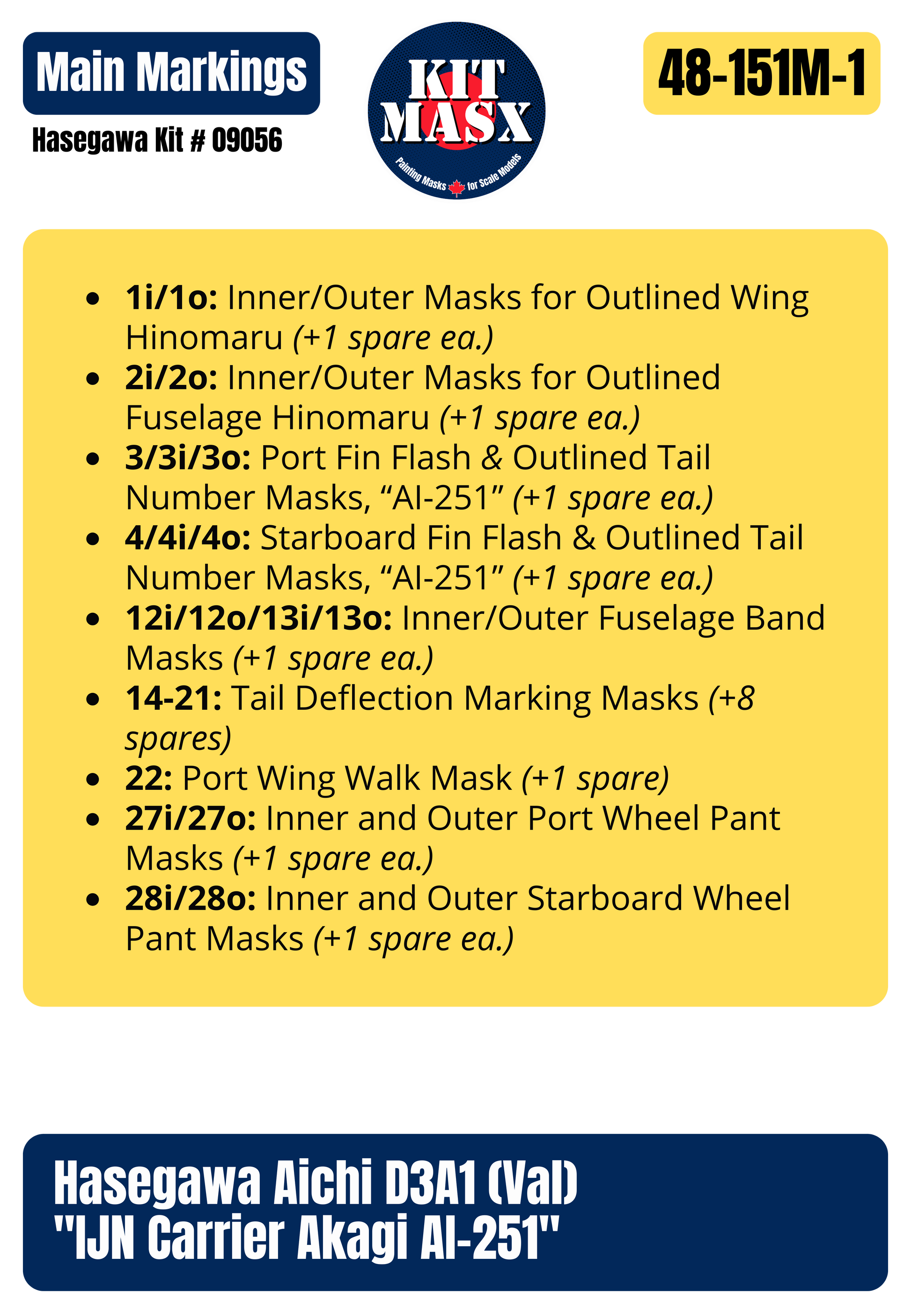 This main marking set includes paint masks to replicate the main markings for the Imperial Japanese Navy (IJN) Carrier Akagi AI-251 marking option from Hasegawa kit # 09056. These markings can be used on any 1/48 Aichi D3A1 (Val).