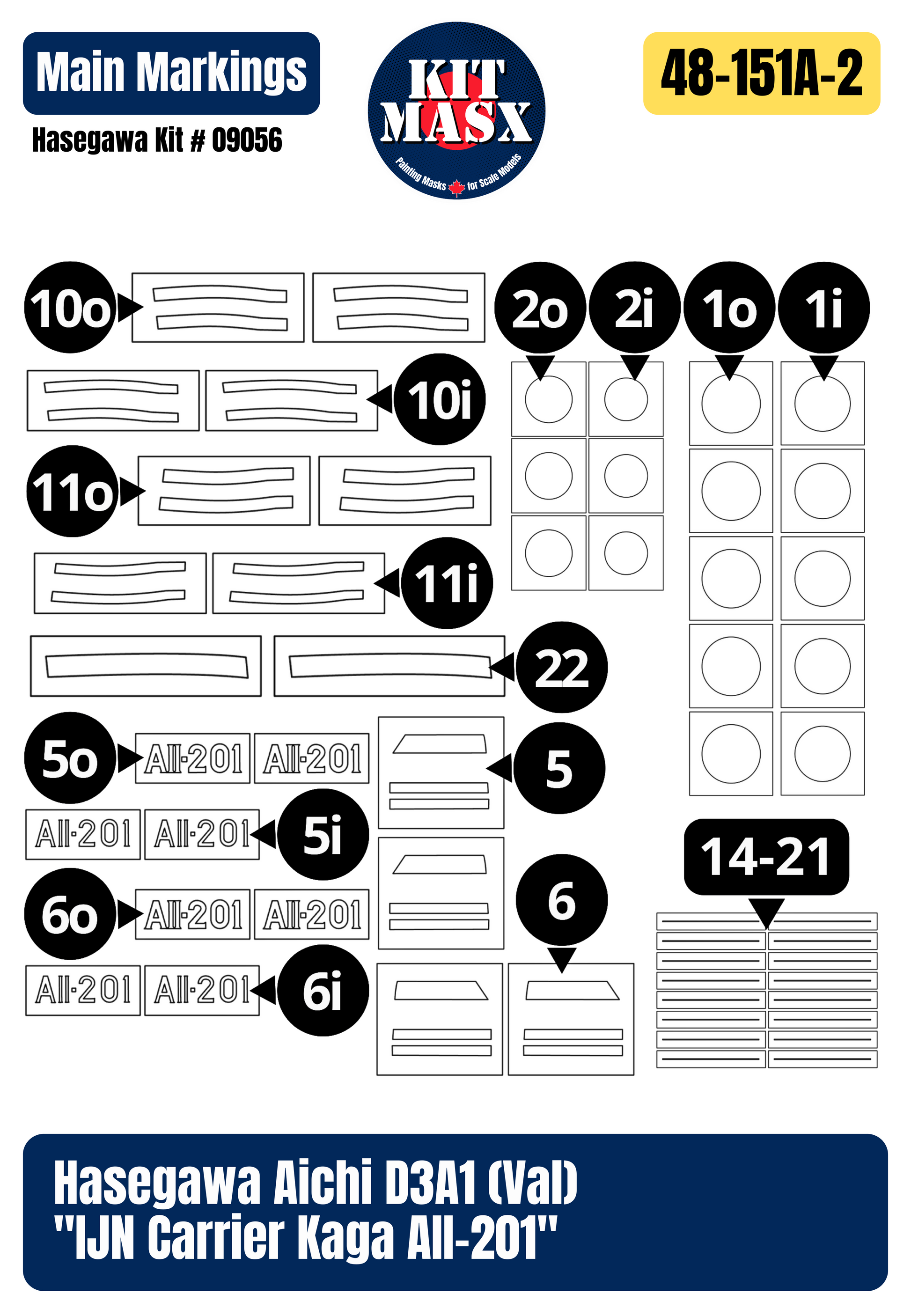 This All-in-One Master Mask Set includes inner and outer canopy and wheel paint masks for the Hasegawa Aichi D3A1 (Val) plus masks to replicate the main markings for the Imperial Japanese Navy (IJN) Carrier Kaga AII-201 marking option from Hasegawa kit # 09056. These markings can be used on any 1/48 Aichi D3A1 (Val).