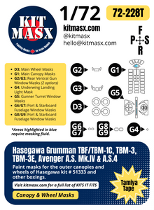 This set includes paint masks for the outer canopies and wheels of the 1/72 Grumman TBM/TBF Avenger kits by Hasegawa and Hobby 2000.