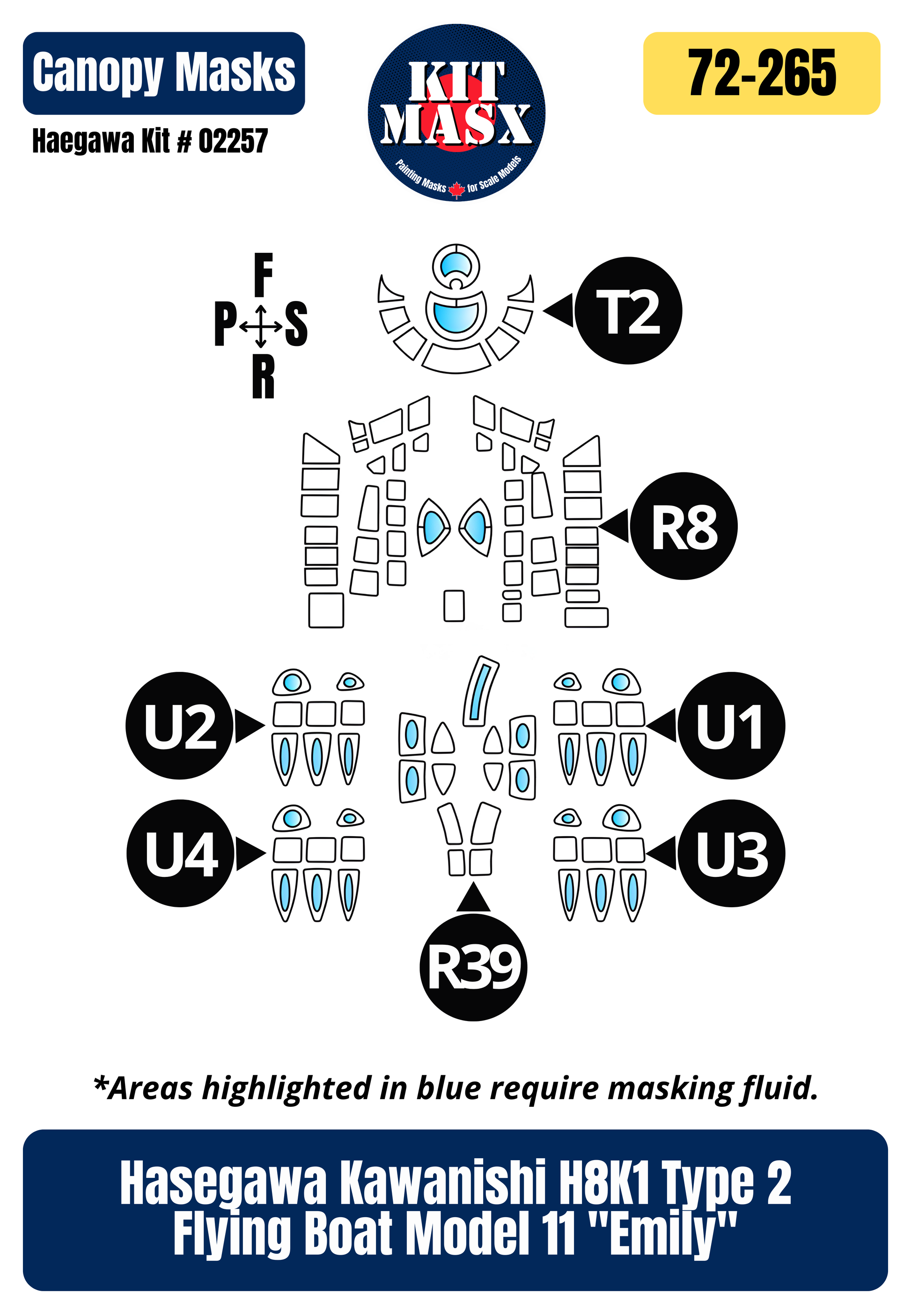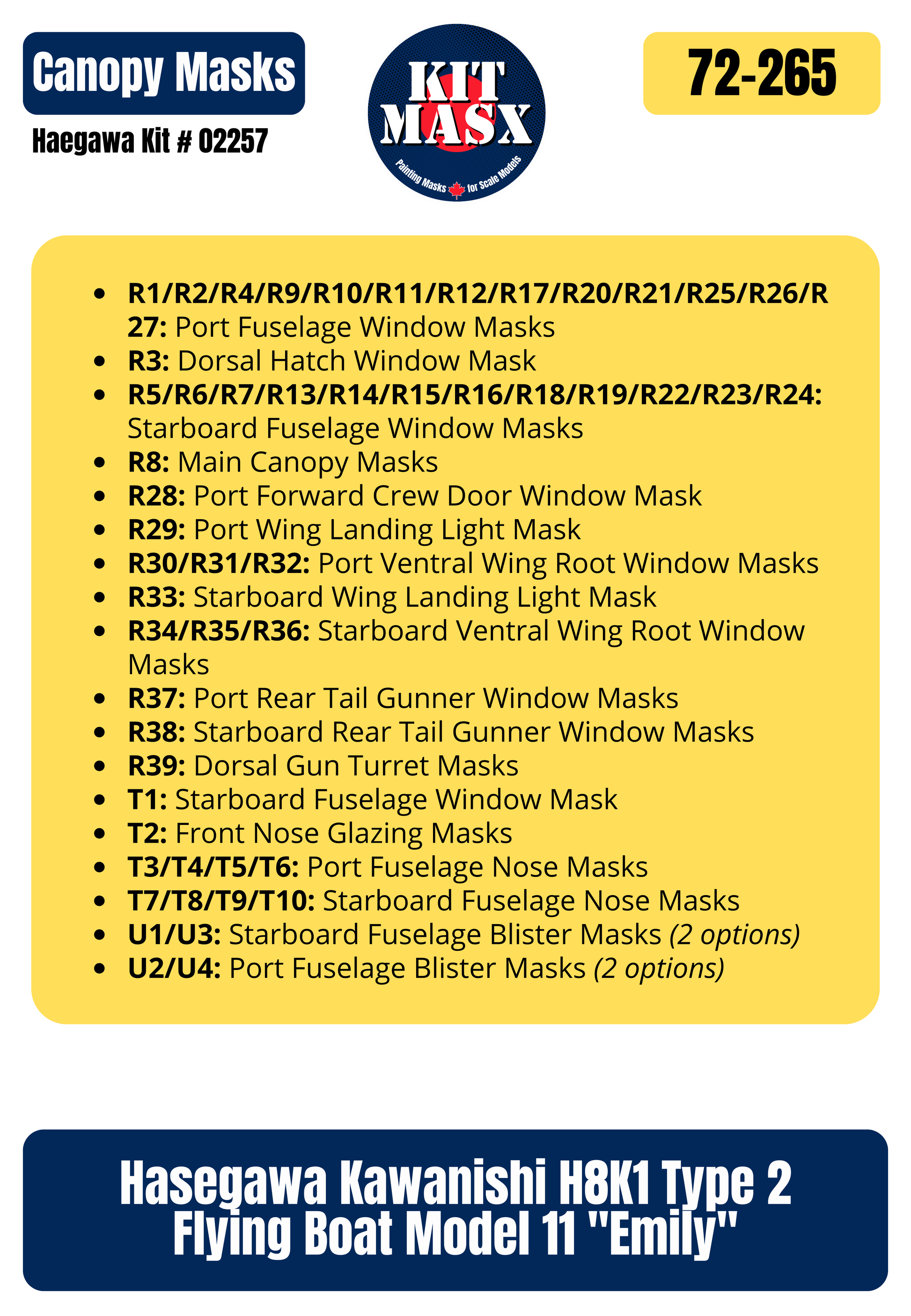 This set includes paint masks for the outer canopies of the 1/72 imposing Kawanishi H8K1 Type 2 Flying Boat Model 11 "Emily" by Hasegawa. Mask every transparency with this set, even the multitude of small windows not covered in the Hasegawa mask set!