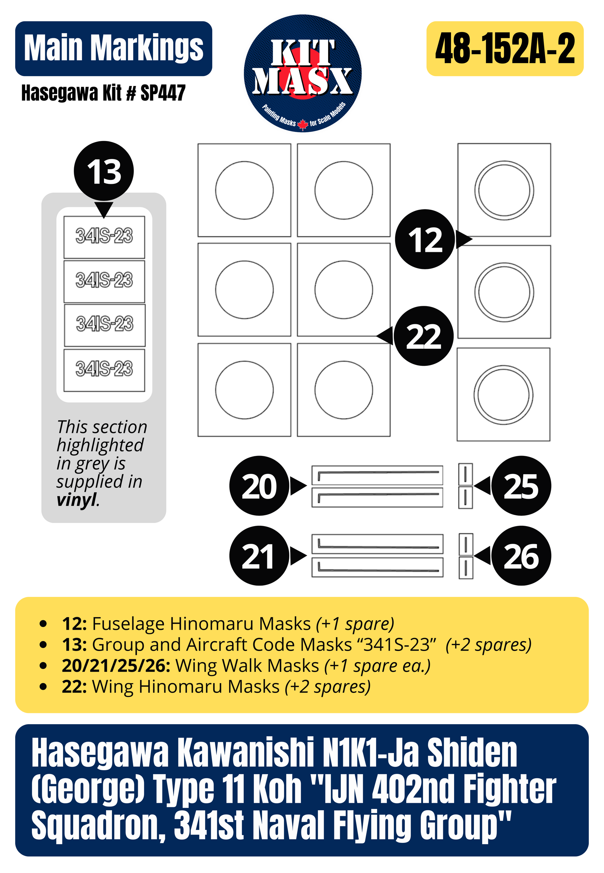 Hasegawa Kawanishi N1K1-Ja Shiden (George) Type 11 Koh "IJN 402nd Fighter Squadron, 341st Naval Flying Group" 1/48 Master Mask Set, Kit # SP447