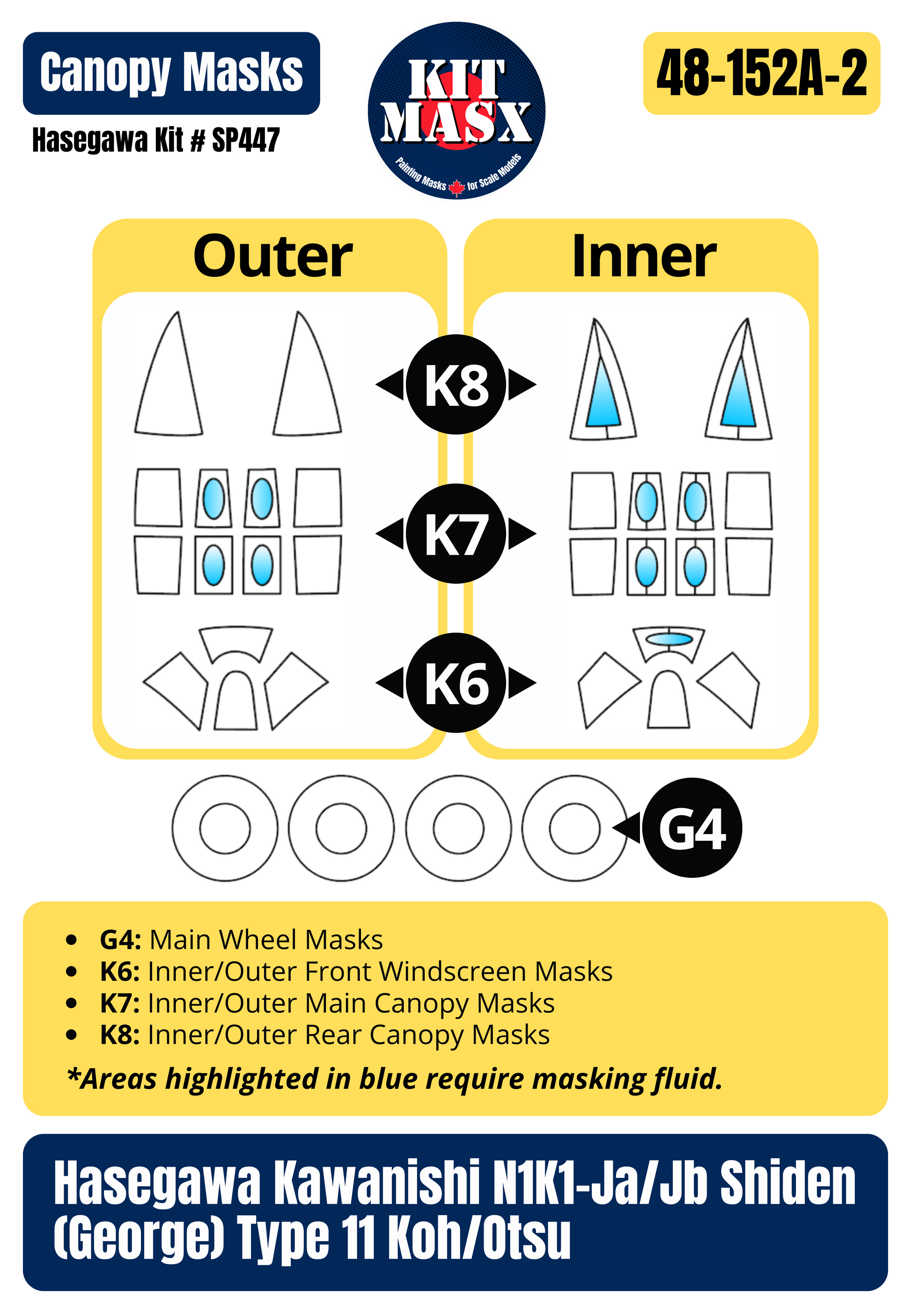 This All-in-One Master Mask Set includes inner and outer canopy and wheel paint masks for the Hasegawa Kawanishi N1K1-Ja Shiden (George) plus masks to replicate the main markings for the Imperial Japanese Navy (IJN) marking option from Hasegawa kit # SP447. These markings can be used on any 1/48 "George."