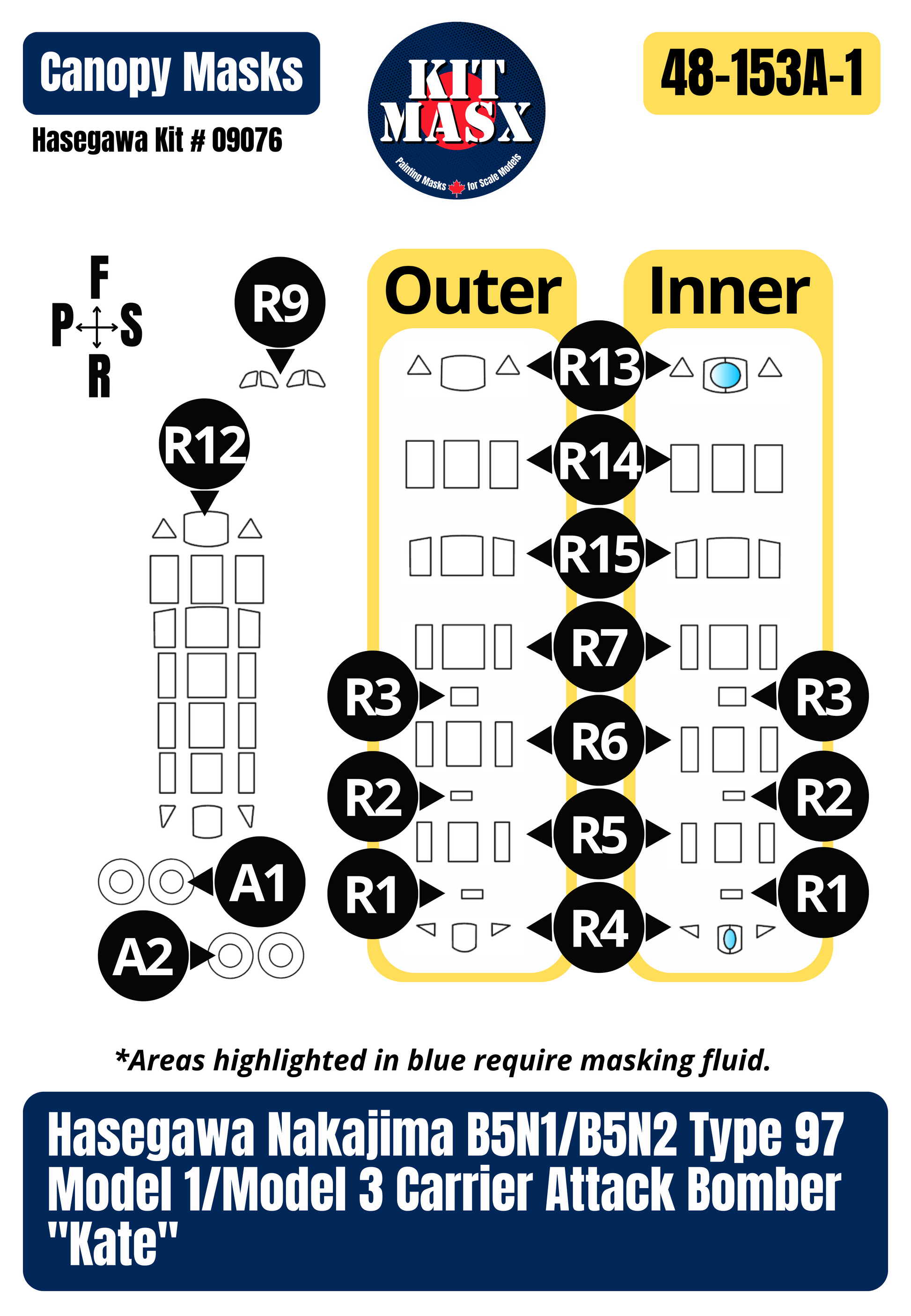- Canopy and Wheel Mask Set: Hasegawa Nakajima B5N1/B5N2 Type 97 Model 1/Model 3 Carrier Attack Bomber "Kate" 1/48 Canopy & Wheel Paint Masks, Kit # 09076