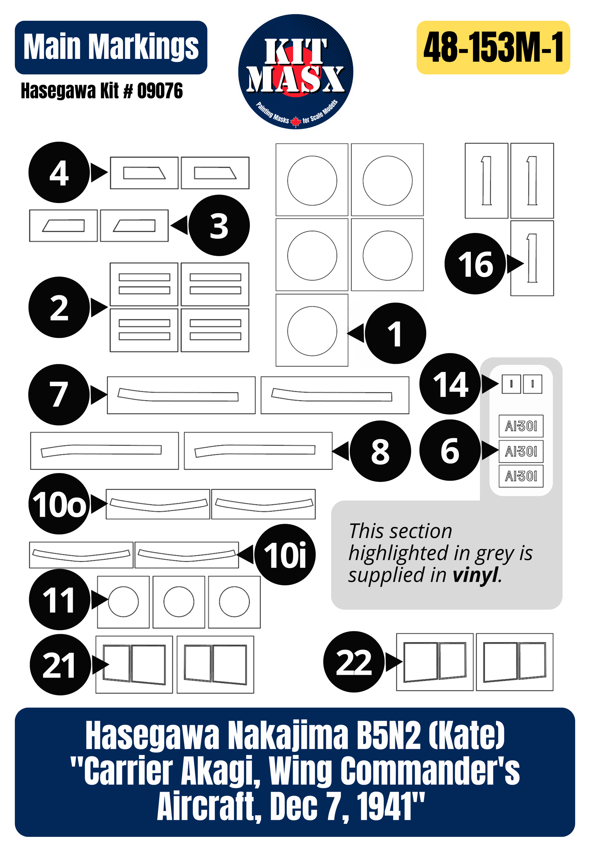 This main marking set includes paint masks to replicate the main markings for the "Carrier Akagi, Wing Commander's Aircraft, Dec 7, 1941" marking option from Hasegawa kit # 09076. These markings can be used on any 1/48 "Kate."