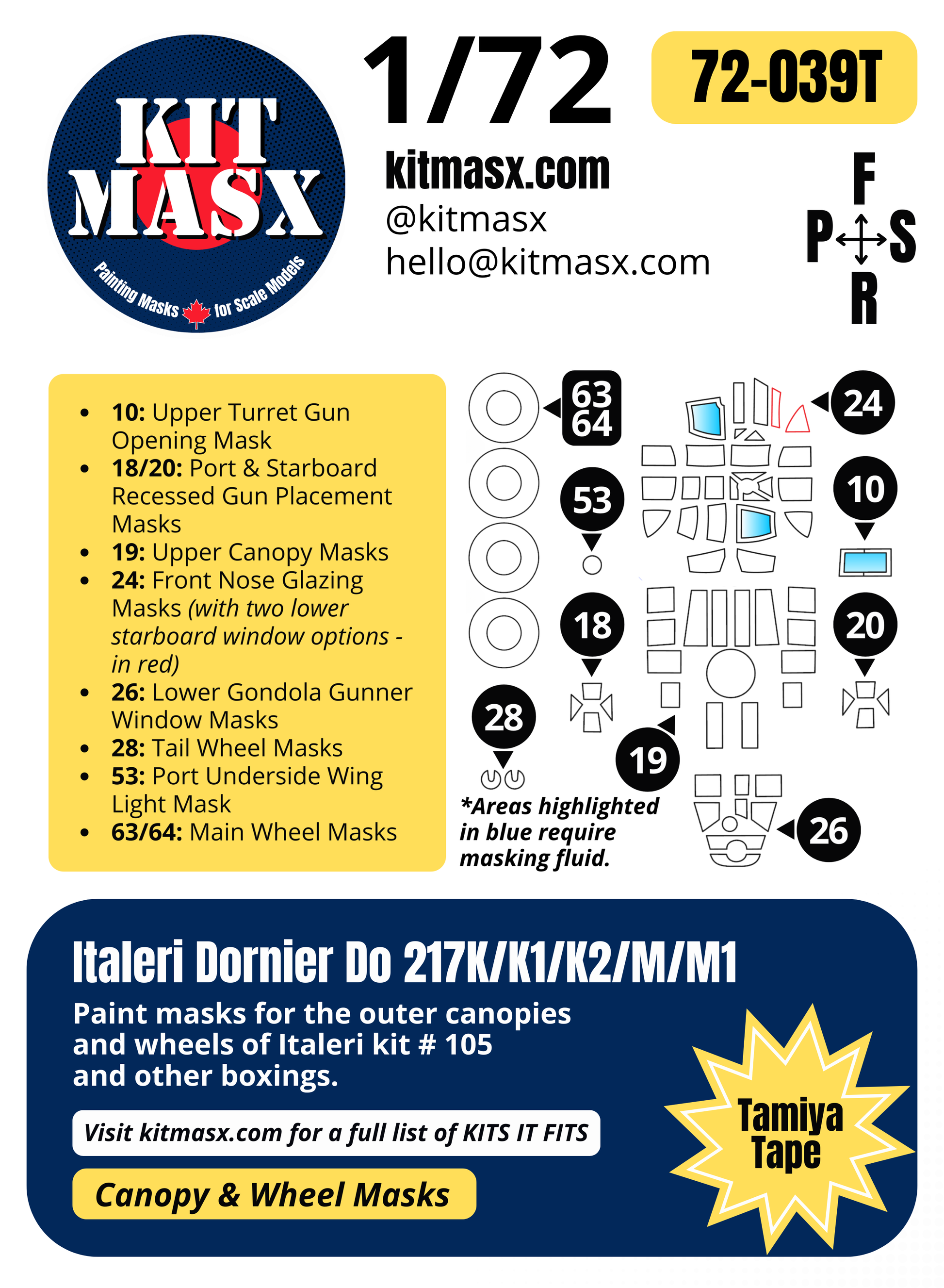 Italeri Dornier Do 217K/K1/K2/M/M1 1/72 Canopy & Wheel Paint Masks, Kit # 105