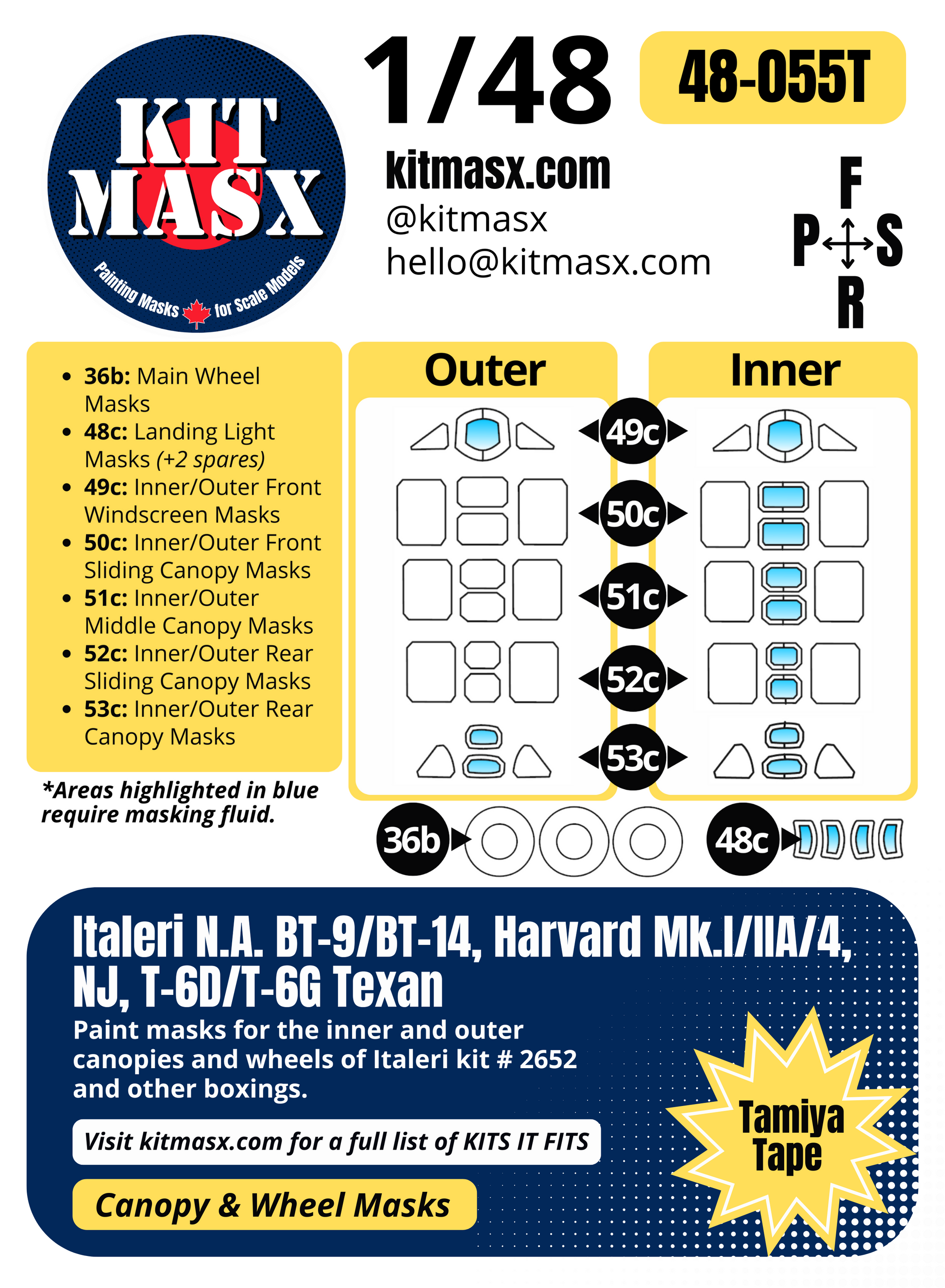 Italeri N.A. BT-9/BT-14, Harvard Mk.I/Mk.IIA/Mk.4, NJ, T-6D/T-6G Texan 1/48 Canopy & Wheel Paint Masks, Kit # 2652