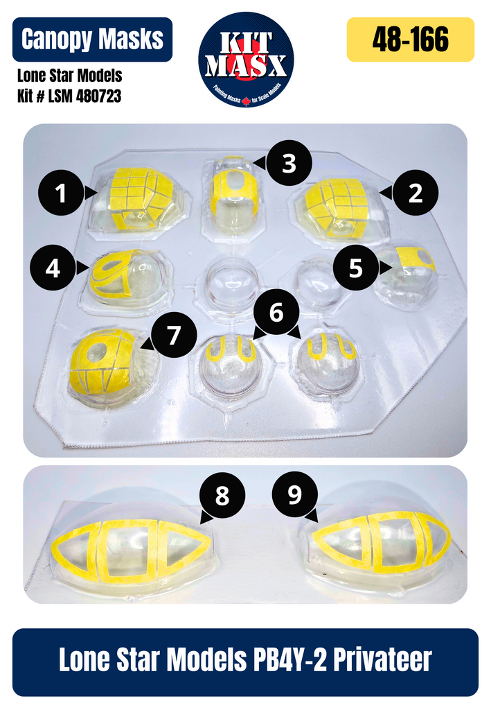 This set includes paint masks for the outer vac-formed canopies of the resin 1/48 PB4Y-2 Privateer by Lone Star Models.