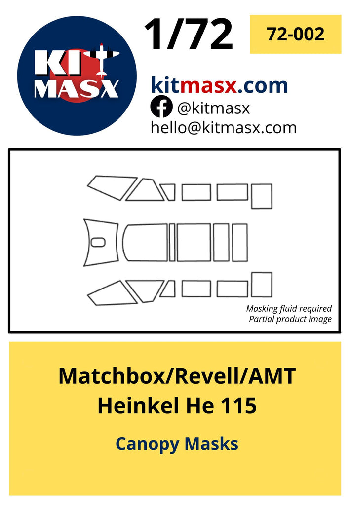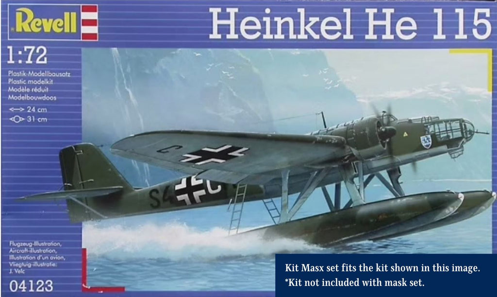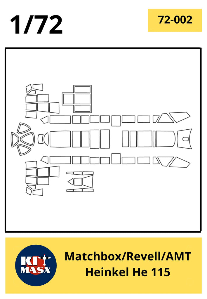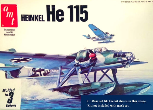 This set includes paint masks for the outer canopies of the 1/72 Heinkel He 115, He 115B, or He 115C Seaplane by Matchbox, AMT, and Revell. Also included are custom ventral window masks for an optional scratch build.