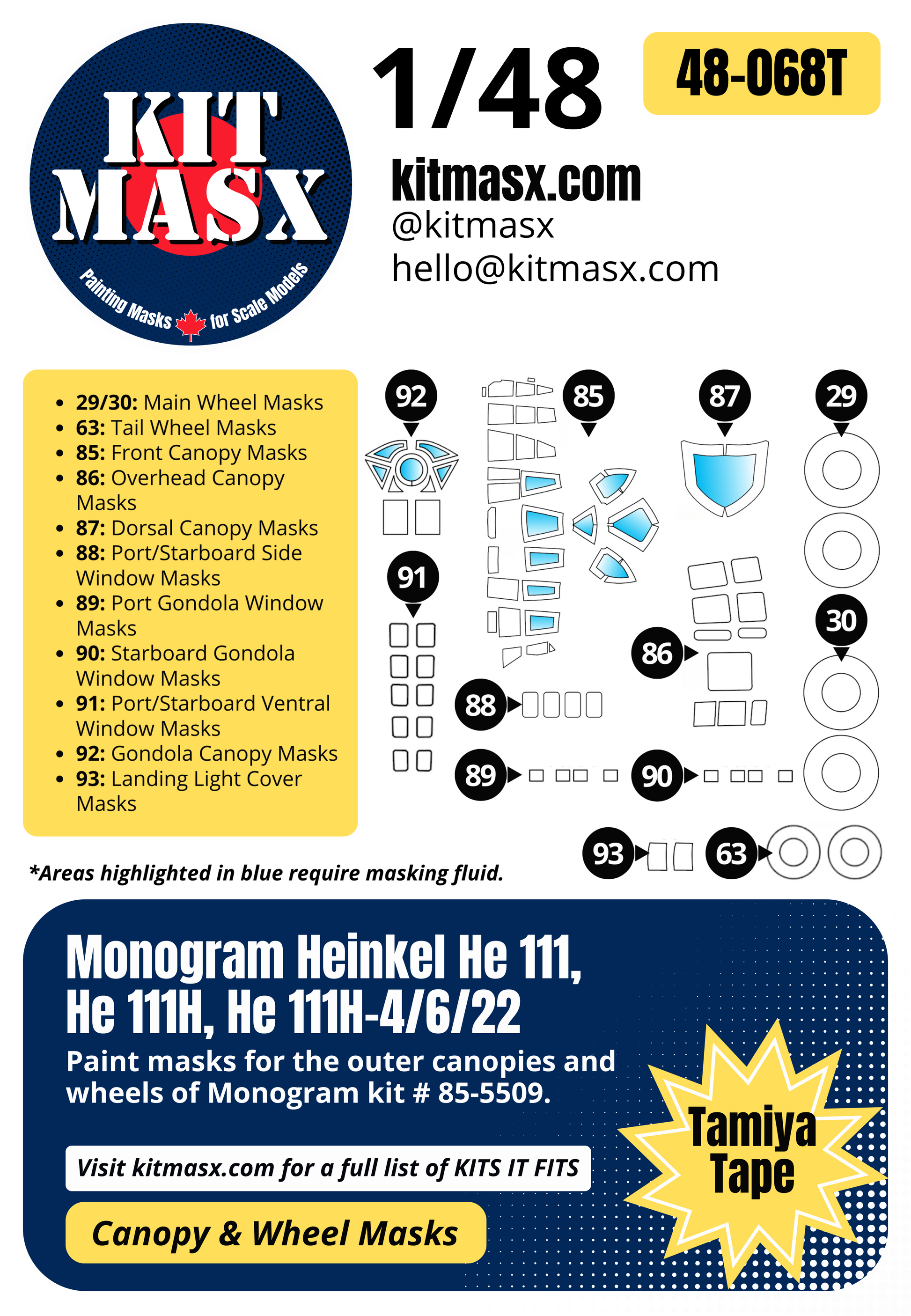 Monogram Heinkel He 111, He 111H, He 111H-4/6/22 1/48 Canopy & Wheel Paint Masks, Kit # 85-5509