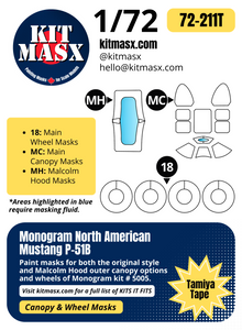 This set includes paint masks for both the original style and Malcolm Hood outer canopy options and wheels of the 1/72 North American P-51B Mustang by Monogram.