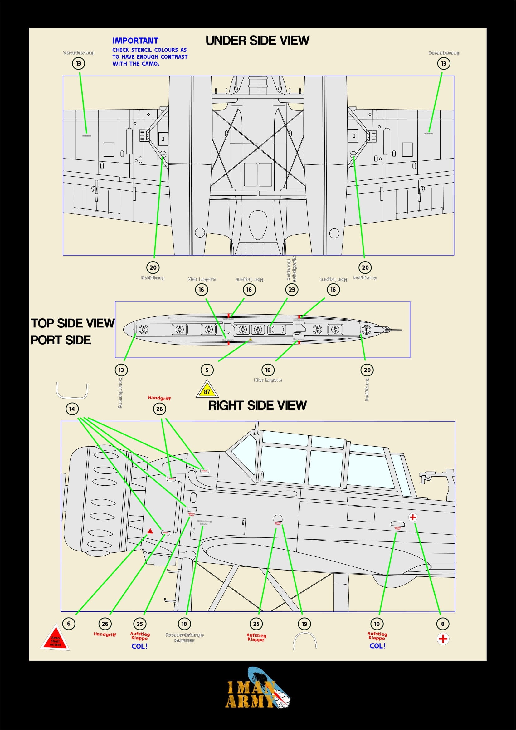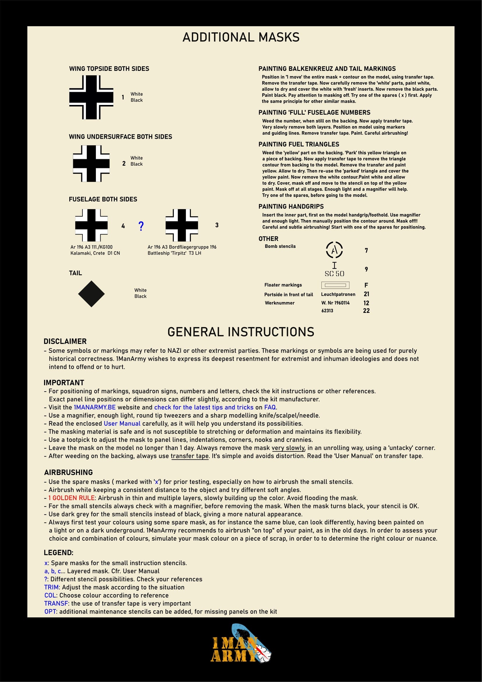This 1ManArmy set includes high definition airbrush paint masks for the basic markings and stencils of the 1/32 Arado Ar 196A-3 by Revell.