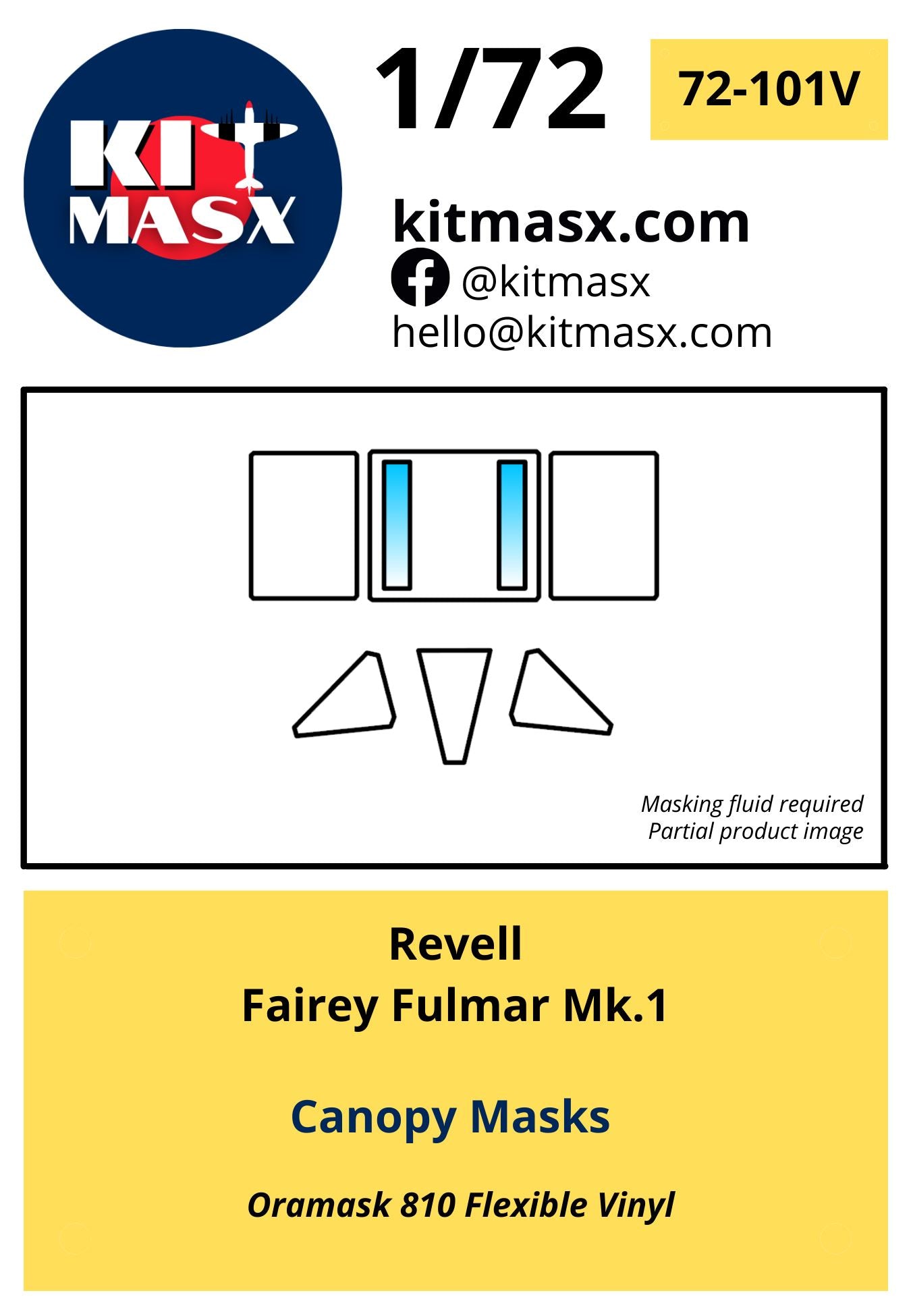 This set includes paint masks for the outer canopies of the 1/72 Fairey Fulmar Mk.I or Mk.II by Airfix, AZmodel, MisterCraft, Revell, Smer, and Vista.