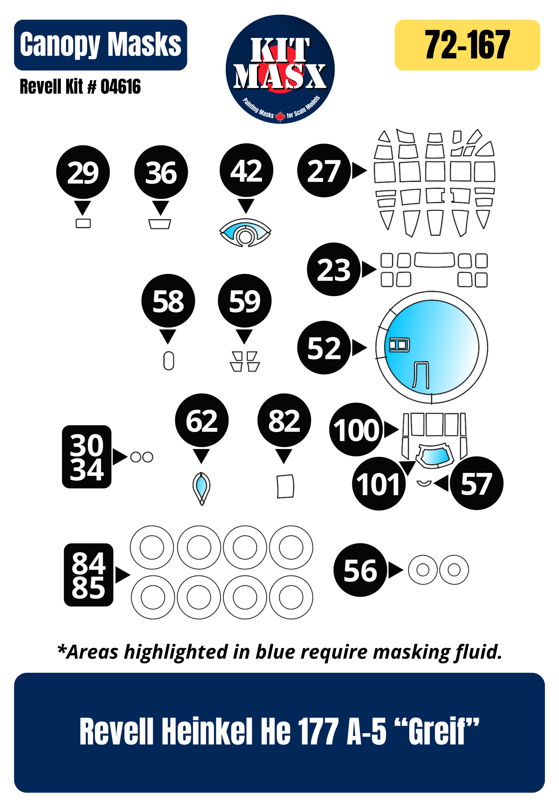 ❗ Note: The Revell He 177 A-6 (Kit No. 04036) includes extra parts for the optional tail gun position (part numbers 131, 132, 134), which are not covered in this mask set., however all other masks in this set will work for the A-6.
