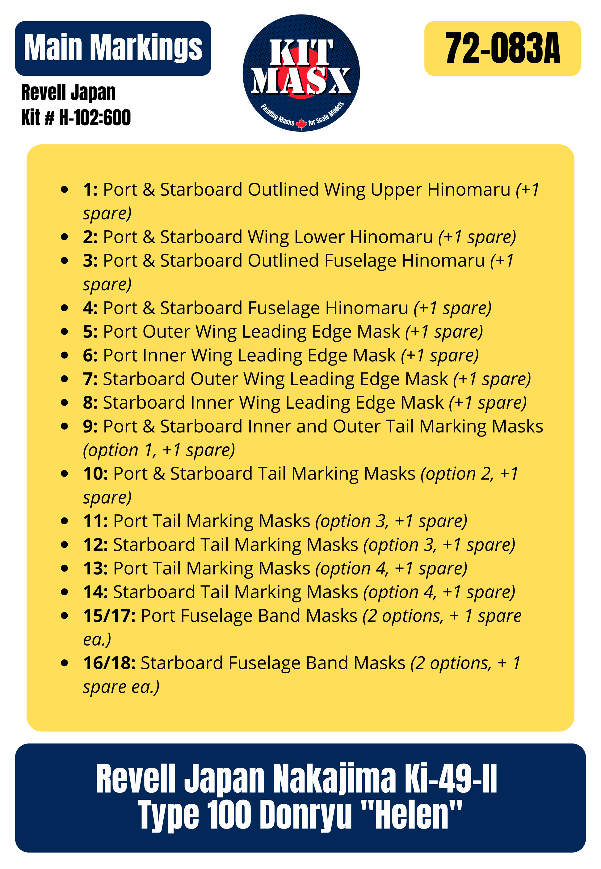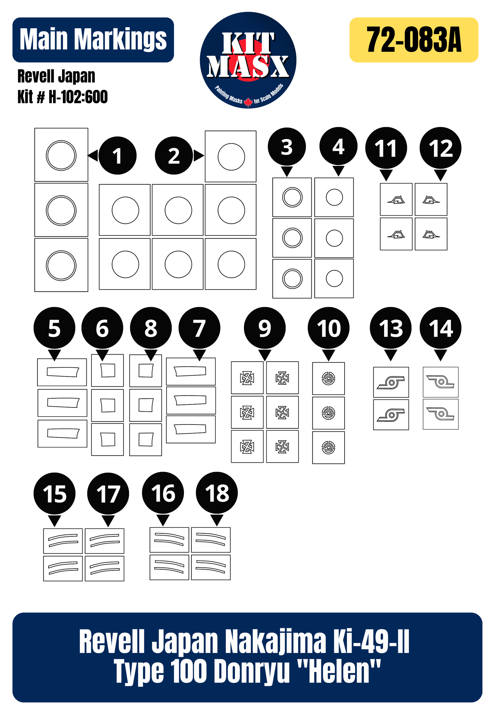 Revell Japan Nakajima Ki-49-II Type 100 Donryu "Helen" 1/72 Main Marking Paint Masks, Kit # H-102:600