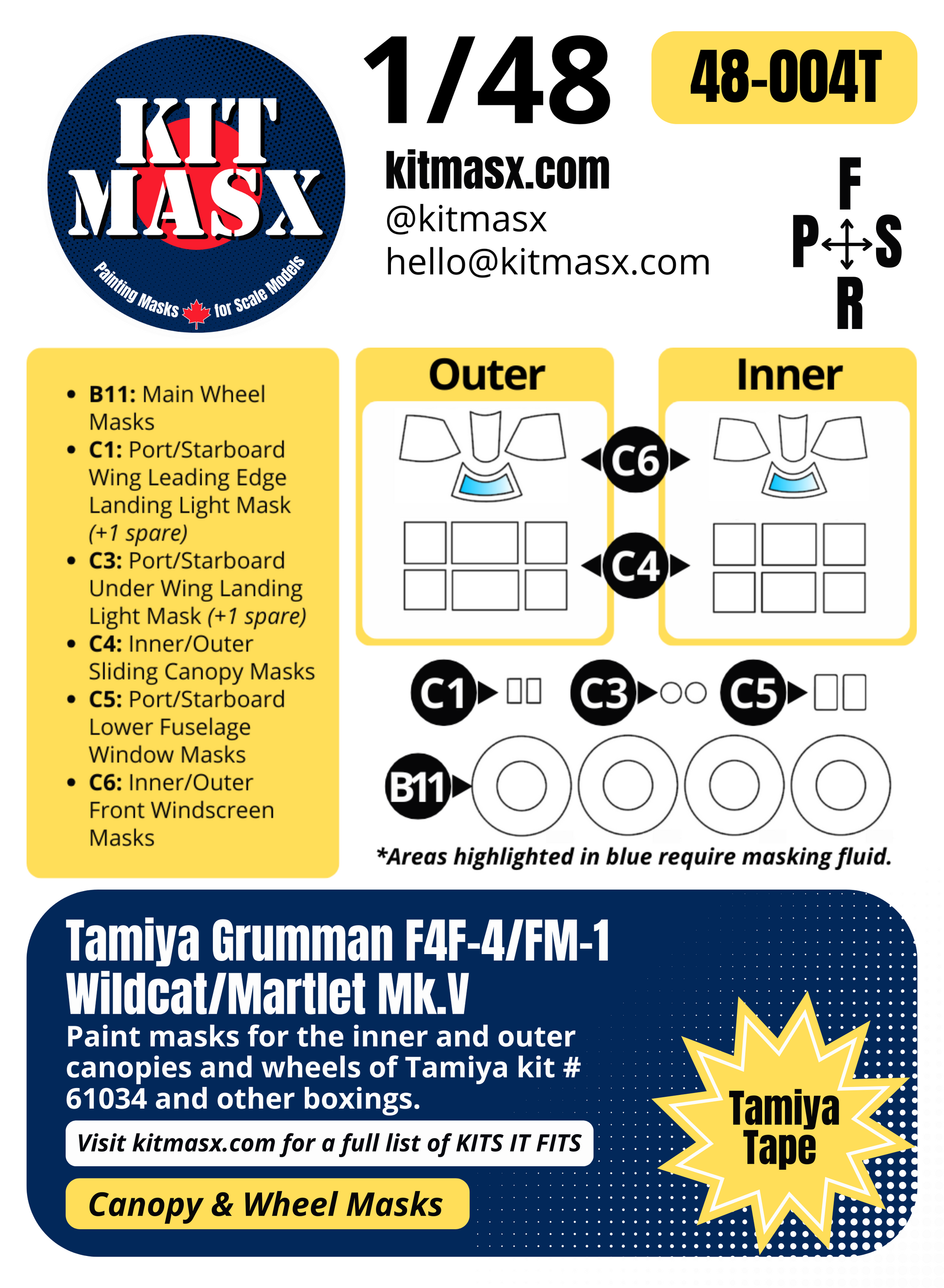This set includes paint masks for the inner and outer canopies and wheels of the 1/48 Grumman F4F-4 Wildcat or FM-1 Wildcat/Martlet Mk.V by Tamiya.