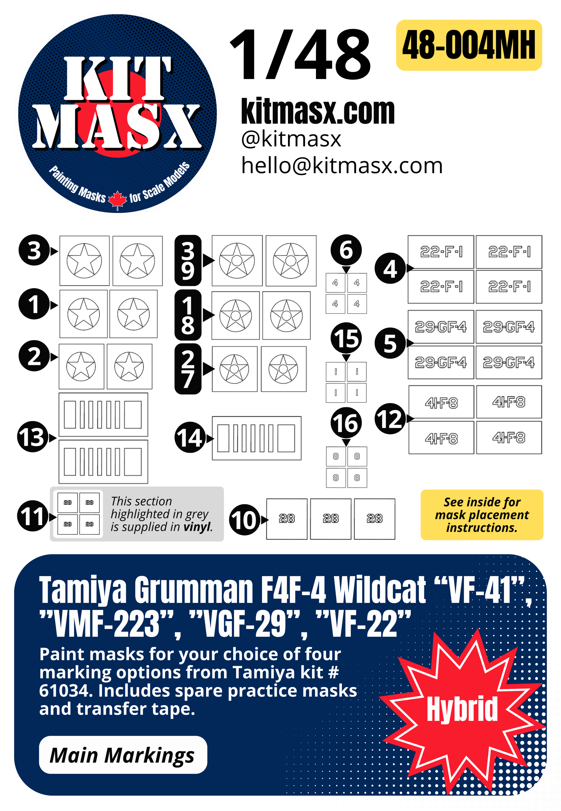 Tamiya Grumman F4F-4 Wildcat “VF-41”, ”VMF-223”, ”VGF-29”, ”VF-22” 1/48 Main Marking Paint Masks, Kit # 61034