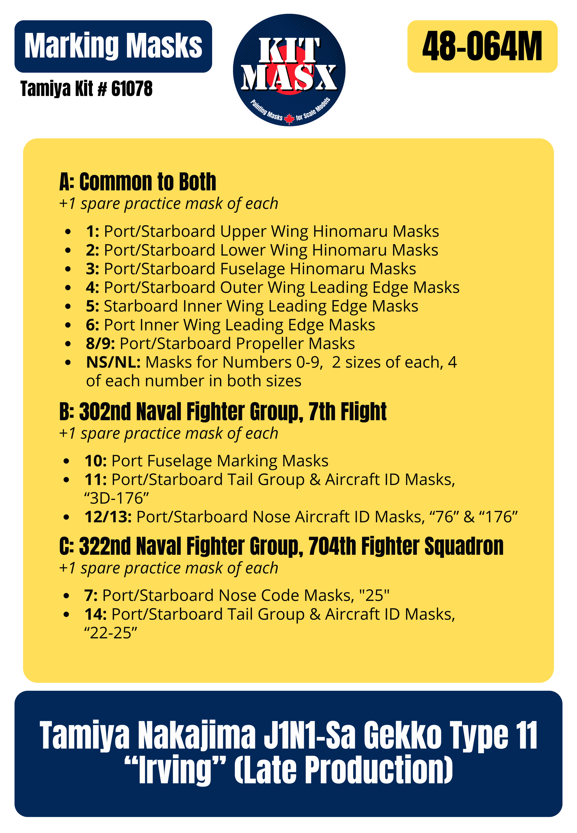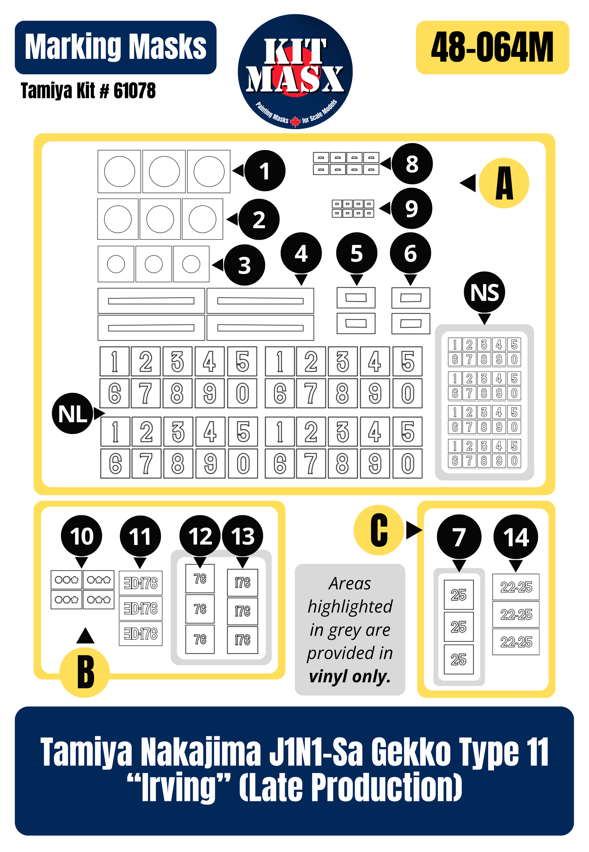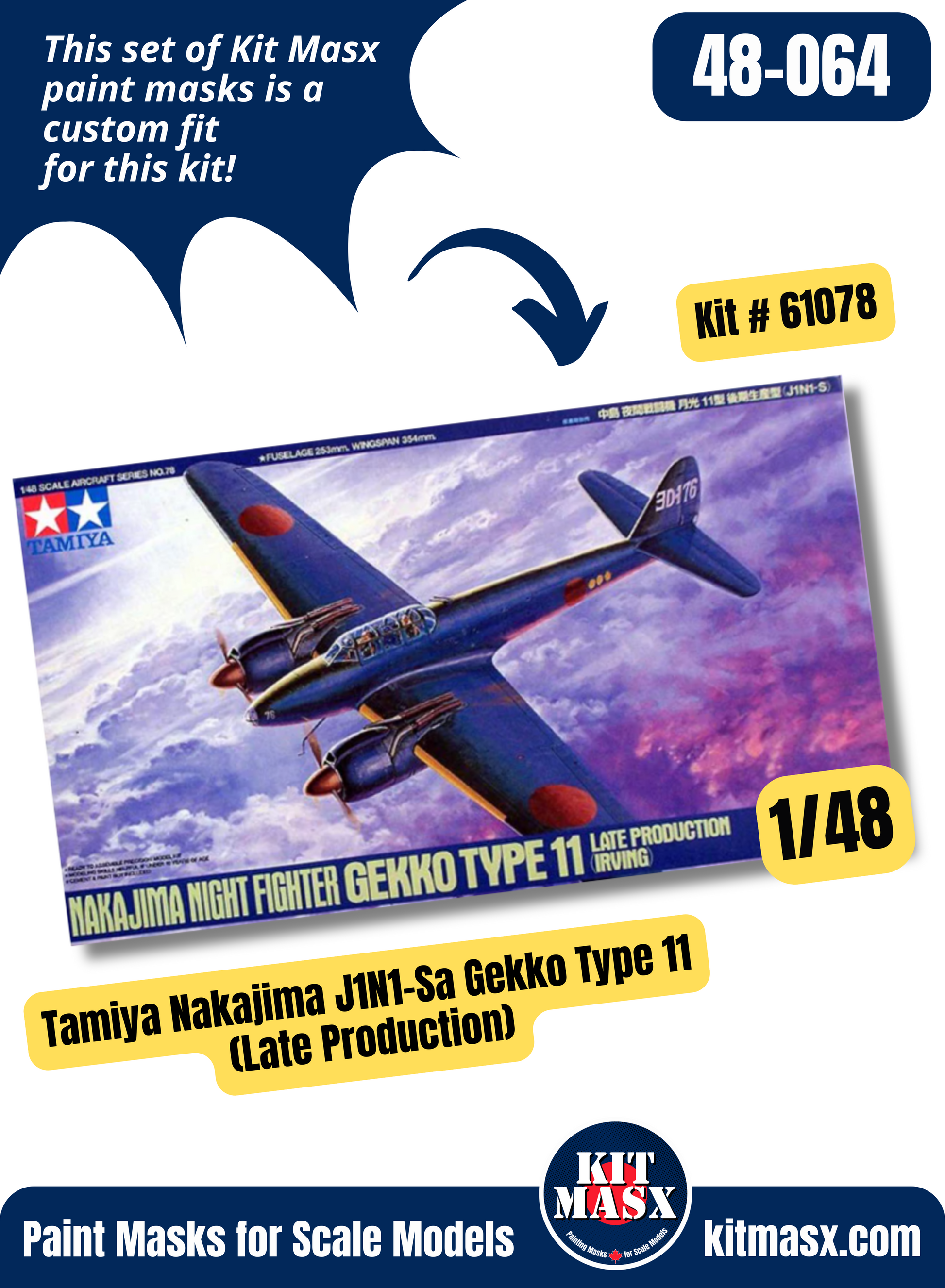 Tamiya Nakajima J1N1-Sa Gekko Type 11 “Irving” (Late Production) 1/48 Main Marking Paint Masks, Kit # 61078