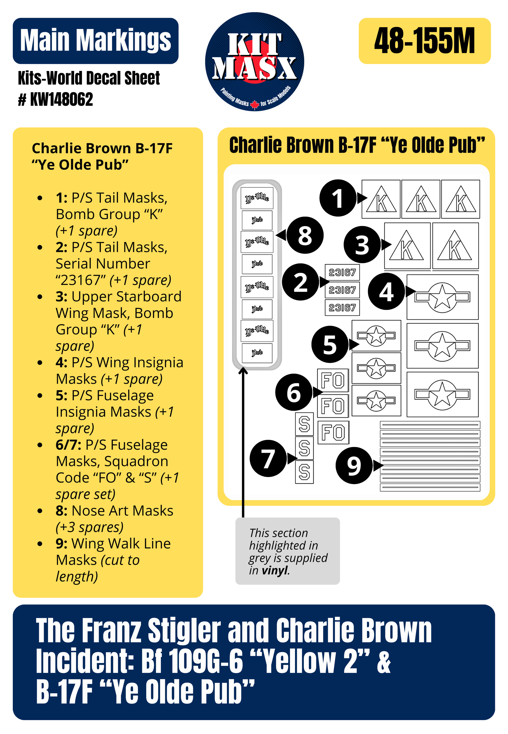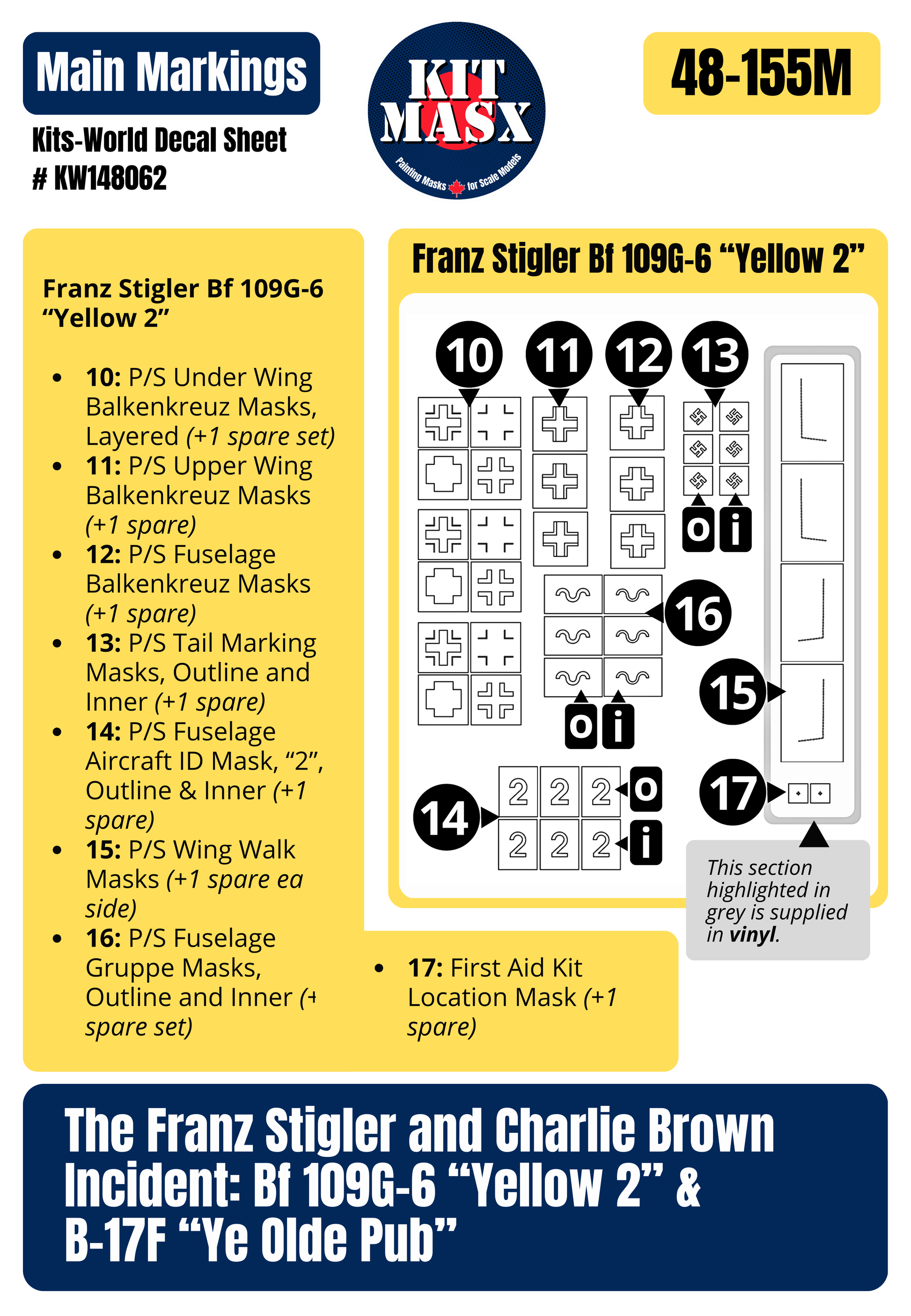 The Franz Stigler and Charlie Brown Incident: Bf 109G-6 “Yellow 2” & B-17F “Ye Olde Pub” 1/48 Main Marking Paint Masks, Decal Sheet # KW148062