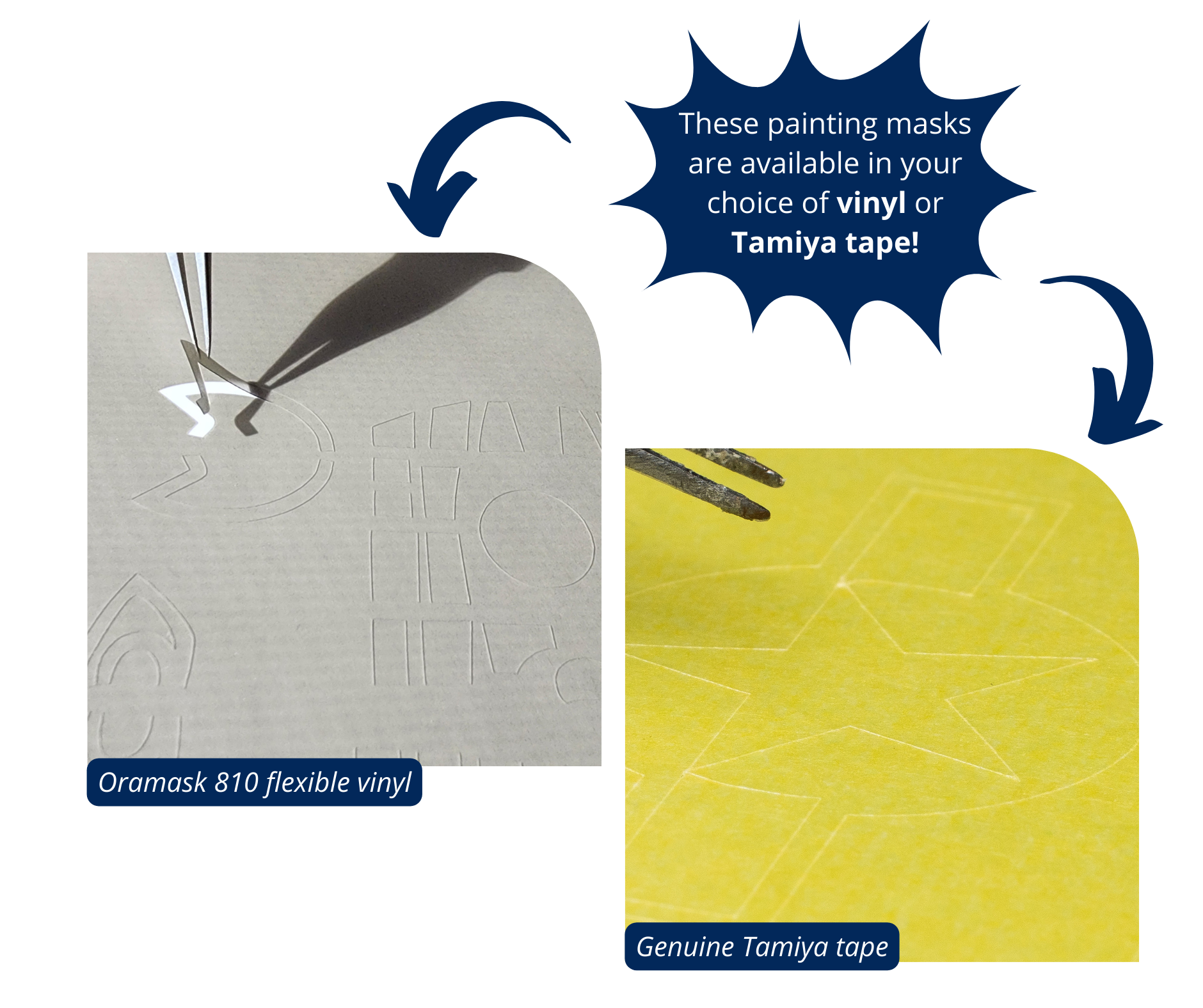This paint mask set is available in your choice of easy-to-apply Oramask 810 flexible vinyl or genuine Tamiya tape.